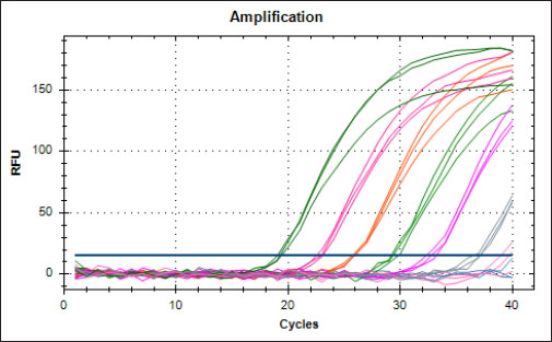 Fig. 3. Amplification plot of standard curve of probe-based qPCR of viral genome copy number in the liver and cloacal swab of chickens infected with FAdV 8b challenge virus. Seven-fold dilution (100–0.0001 ng).