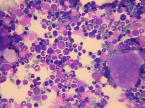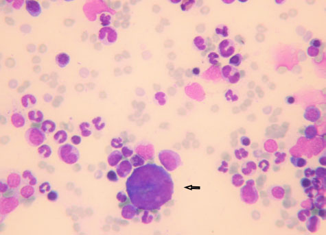 Fig. 2. Promegakariocyte (arrow) and several erythroid and myeloid precursors. May Grunwald Giemsa ×40 objective. All the normal bone marrow samples were analyzed together with a CBC. The results of the hemogram were listed in Table 2. Anemia, alone or associated with other cytopenia, was the most important hematological alteration. However, a normal CBC was found in a significant proportion of cases, more often in the lymphoma and unknown indication subgroups (Table 3). DiscussionThe hematopoietic system function can be assessed only by the simultaneous examinations of the blood and bone marrow. The data coming from those quantitative and qualitative exams should be interpreted all together. A normally functioning hematopoietic tissue is characterized by a normal CBC associated to a bone marrow without any numerical or morphological abnormalities (Harvey, 2012; Turinelli et al., 2015). However, it is important to outline that the bone marrow is a very dynamic tissue that can change quite rapidly, depending on the stimulus to which is exposed and to the alteration in its microenvironment. The bone marrow changes are related to the blood ones, but they can move up or follow the CBC alteration with a certain degree of time (Harvey, 2012; Raskin and Messick, 2012; Turinelli et al., 2015). Both tissues are under the control of a plethora of cytokines that have effect on different cell lineages at different stages and that can be related to precise clinical state, like for example erythropoietin that is secreted by renal cells under hypoxic condition.