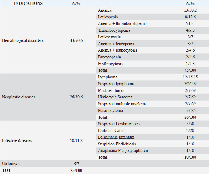 The erythrocytosis associated to a normal myelogram could be an artefact or the consequence of splenic contraction (Watson, 2000) whereas the lymphocytosis could not be related to a bone marrow alteration because lymphocytes can come from other sites. They in fact are unique among leukocytes in their ability to recirculate (Shultze, 2000). The staging or the suspicion of lymphoma bone marrow metastasis represented the second most important indication for the bone marrow cytological exam (19 cases, 22.3% of all the cases and 46.1% of the neoplastic diseases). The majority of them has a normal CBC (63.1%). This finding is completely in agreement with the literature because it is already well known that stage V lymphoma, which is classically defined as involvement of the blood, bone marrow, and/or extranodal sites, is not as frequently identified as other stages of lymphoma when routine diagnostic tests are applied (Graff et al., 2014). Moreover, the incidence of lymphoma bone marrow metastasis seems to be low as it is demonstrated by two important retrospective study on bone marrow disorders, that show only 2.4% and 4% of incidences, respectively (Turinelli et al., 2015; Weiss, 2006). Inside the neoplastic disease indications, already diagnosed histiocytic sarcoma and suspected multiple myeloma were poorly represented (2.3% each one) and both were associated to a normal CBC (50%) or to and altered hemogram consisting of anemia plus leukocytosis (50%). This is in line with the literature because it is already known that both histiocytic sarcoma and multiple myeloma are characterized by bone marrow neoplastic cells infiltration/proliferation even if sometimes the neoplastic cells could be heterogeneously disseminated over the bone marrow sites; for this reason, it is suggested to sample multiple sites (Vail, 2000, 2013; Moore et al., 2006; Moore, 2017) or to perform core biopsy. This could explain the normal myelogram in those few cases found, otherwise, it is possible that the histiocytic sarcoma did not have already infiltrated the bone marrow and the multiple myeloma was not the reason of the clinical illness. Two cases of mast cell tumor (MCT) staging were included in the group and both have a normal CBC. This finding is in agreement with the literature, in fact, it has been already reported that buffy coat smears are not useful for the diagnosis or staging of canine MCTs and higher numbers of mast cells can be seen on the buffy coat smears of dogs with non-MCT diseases compared to dogs with MCT (Kiuppel, 2017). Moreover, the incidence of bone marrow MCT metastasis seems to be very rare with an incidence of 2.8% of cases in a previous study evaluating a series of 157 dogs presented for MCT in which a CBC and a myelogram were performed (Poggiani et al., 2013). Indeed, although systemic mastocytosis has been reported in dogs, this is a rare condition, and the vast majority of dogs with cutaneous MCTs do not have circulating mast cells or evidence of bone marrow infiltration (Dobson and Scase, 2007). Suspected or diagnosed infective diseases were the third most important indication for the myelogram. Inside this group leishmaniosis was the principal represented infection (5 cases suspected and 1 already diagnosed through serological exam; 7% of the total exams). Normal CBC was detected in half of cases (50%) whereas anemia, alone or associated to thrombocytopenia, was found in the other 50%. Bone marrow cytology of canine leishmaniosis is often characterized by erythroid hypoplasia, myeloid, plasma cells, and macrophages hyperplasia. Amastigotes can be found inside the cytoplasm of the macrophages or spared in the background but if they are few they cannot be found or, maybe, difficult to see. The most important CBC alteration is the presence of non-regenerative anemia (Paltrinieri et al., 2016). In this study, any bone marrow alterations were found, neither in the diagnosed case, nor in the suspected ones, maybe because the number of parasites was low or maybe because the dogs were not infected at all. A polymerase chain reaction test, PCR, on bone marrow samples, was suggested in all the cases. Two diagnosed and one suspected ehrlichiosis were included in this study (3.5%). All the cases presented an altered CBC, characterized by anemia alone or pancytopenia that is in line with the literature (Harrus and Waner, 2011). The normal myelogram could be explained because of an early stage of the disease in which the bone marrow is not already compromised, even if mild cytopenia are detected in the blood. With the progression of the disease the bone marrow is almost always affected, and the pancytopenia become more severe. This is the hallmark of the chronic and severe form (Harrus and Waner, 2011). Serial CBC and a second cytological bone marrow exam, together with a core biopsy for histological control were strongly recommended, for all the cases. Finally, only six normal myelograms (7%) were performed without any clinical or hematological indication; all those bone marrows were associated to a normal CBC. Those findings suggested that, probably, the clinical problem/suspicion did not involve the hematopoietic tissue. In conclusion, this study showed that a normal myelogram, if not associated to a normal CBC, rarely indicates a well-functioning hematopoietic system. If the hemogram is altered a normal myelogram should be considered as not representative of a well-functioning bone marrow tissue and the cause could be intrinsic or extrinsic (deficit of stimulating factors, alteration in the bone marrow cells receptors, stroma, etc.) and should lead to a delayed second investigation because bone marrow and blood are dynamic tissues that can change rapidly and not simultaneously. When possible, a core biopsy should be associated in order to better asses the cellularity and eventually the neoplastic infiltration. Conflict of interestThe authors declare that there is no conflict of interest. Refere