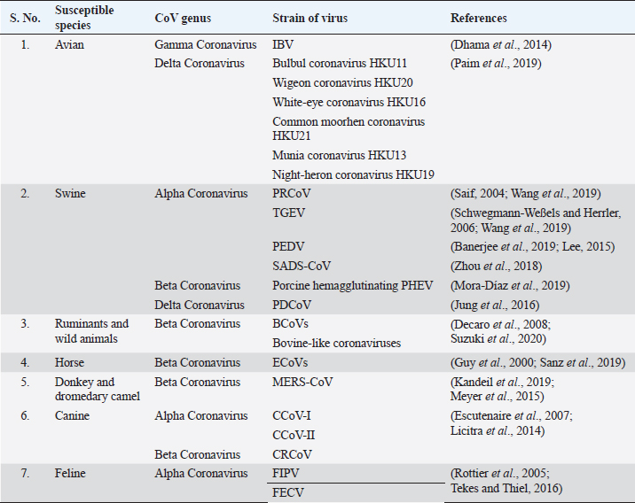 CoVs have the ability to infect different animals that may include humans, farm animals, companion animals, bats, laboratory animals, wild animals, and marine whales (Salata et al., 2020). Alphacoronaviruses and betacoronaviruses infect bats and other mammals only, whereas gammacoronaviruses and deltacoronaviruses infect birds, but some of them can also infect mammals and fishes as well (Table 1) (Cui et al., 2019). Infectious bronchitis virus (IBV), a member of gammacoronavirus, is the most common avian coronavirus that causes avian infectious bronchitis (IB) disease (Dhama et al., 2014). IB is responsible for significant morbidity and mortality in the poultry population, including pheasants, turkeys, and guinea fowls of all ages (Smith et al., 2015). Especially birds of younger age groups are highly susceptible, causing massive economic losses to the global poultry industry (Dhama et al., 2014; Smith et al., 2015). After the introduction of the virus in the birds through different routes, like feco–oral route and airborne transmission, the virus usually replicates in ciliated epithelial cells of the respiratory tract and causes severe respiratory infections, like coughing, nasal discharge, rales, gasping, swollen sinus, and also affects the digestive, reproductive, and urogenital tract, resulting in nephritis and egg drop syndrome (Weiss and Navas-Martin, 2005; Fan et al., 2018). Other CoVs from the deltacoronavirus genus include Bulbul coronavirus HKU11, Wigeon coronavirus HKU20, White-eye coronavirus HKU16, Common moorhen coronavirus HKU21, Munia coronavirus HKU13, and Night-heron coronavirus HKU19 that can severely infect birds with more complications (Paim et al., 2019). Even though there were different attempts for effective vaccine development against the CoVs, the rapid mutations and antigenic variations created a hindrance to successfully trigger the local immune response and cure infections (Saif, 2020; Zhang et al., 2020b). Viruses from alphacoronavirus, betacoronavirus, and deltacoronavirus affect the porcine population. Currently, six CoVs are circulating in the swine population. Alphacoronavirus infection in pigs includes four CoVs: porcine respiratory coronavirus (PRCoV), transmissible gastroenteritis virus (TGEV), porcine epidemic diarrhea virus (PEDV), and swine acute diarrhea syndrome coronavirus (SADS-CoV). Deltacoronavirus infection in pigs includes porcine deltacoronavirus (PDCoV), and betacoronavirus responsible for pig disease is porcine hemagglutinating encephalomyelitis virus (PHEV) (Wang et al., 2019). PRCoVs cause respiratory infections; TGEV, PEDV, SADS-CoVs, and PDCoVs cause acute gastroenteritis; and PHEV results in severe neurological and digestive disorders (Mora-Díaz et al., 2019; Wang et al., 2019). TGEV is a highly contagious, economically significant, and the oldest known swine CoV, mostly spread by feco–oral route affecting young pigs. TGEV virus targets the absorptive epithelial cells of villi causing its atrophy, leading to severe diarrhea, vomition, rapid weight loss, and death (Doyle and Hutchings, 1946; Weiss and Navas-Martin, 2005; Schwegmann-Weßels and Herrler, 2006). Currently, live attenuated and inactivated vaccines are available for the pregnant sow. PRCoV, an attenuated variant of TGEV, originated by the deletion of large 5’ region in the spike gene of the virus, is an example of the evolution of CoVs with altered virulence property and tropism (Saif, 2004). PEDV is an important enteric virus of swine which was introduced in a pig population in the early 1970s, mostly affecting growing and fattening pigs and is believed to be the consequence of spillover from bats, causing tremendous economic losses to the American, European and Asian pork industries (Lee, 2015; Banerjee et al., 2019). More than 8 million piglets died due to PEDV in 2013 in the USA, Canada, and Mexico (Lee, 2015). PEDV, mainly transmitted by the respiratory route, uses the same receptor as TGEV for entry in host cells and it is also closely related to Scotophilus bat coronavirus 512, human alphacoronaviruses HCoV-299E, and HCoV-NL63, which are likely to have common evolutionary precursors (Banerjee et al., 2019). Various vaccines are designed to cope with PEDV in swine populations (Lee, 2015; Hsueh et al., 2020). Digestive and nervous systems in pigs of all age groups are affected by PHEV, which was first isolated in 1962 and the virus was identified as a neurotropic virus, which showed subclinical presence worldwide (Mora-Díaz et al., 2019). SADS-CoV, having more than 86% and 96% sequence identity with bat alphacoronavirus HKU2-CoV and Rhinolophus spp., respectively, is another virulent swine alphacoronavirus causing enteritis in the small piglets, which indicates that SADS-CoV and HKU2-CoV descended from a common ancestor (Zhou et al., 2018). Recently, in 2012, PDCoV, which caused a mild infection to the pigs, was detected in Hong Kong in the porcine population, which is closely related with quail deltacoronavirus UAE-HKU30, and it was proposed that the virus originated from the recombination between sparrow CoV HKU15 and Bulbul CoV HKU11 by host switching activity between avian and mammalian CoVs (Jung et al., 2016). In the experimental infection, swines were found to be infected with Middle East respiratory syndrome coronavirus (MERS-CoV) and SARS-CoV, but not with SARS-CoV-2 (Wang et al., 2005; Vergara-Alert et al., 2017; Shi et al., 2020). Ruminants and wild animals are known to be infected by the number of CoVs. Bovine coronavirus (BCoV) is the oldest known ruminant CoV of betacoronavirus genus having the ability to cause severe clinical complications, including enteric diseases, like calf diarrhea in neonates and bloody diarrhea in adult cattle, and a respiratory form known as shipping fever in cattle of all age groups (Decaro et al., 2008; Suzuki et al., 2020). BCoVs are thought to be evolved from rodent CoVs and transmitted by the feco–oral route, mai