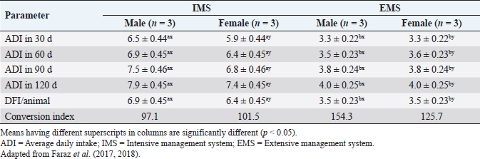 Statistical analysisData collected on different parameters were analyzed statistically by using Fisher’s analysis of variance technique having 2 × 2 factorial arrangements of treatments under completely randomized design (CRD) (Steel et al., 1997) using generalized linear model (GLM) of Statistical Package for the Social Sciences software (SPSS, 2008). Tukey’s test at 0.05 levels of significance was used to compare the differences among the treatment means. Ethical approvalIn the current study, camels were fed according to the farm routine practices having grazing/browsing and stall feeding available. They were provided fresh, clean water and salt loops. Camels were vaccinated and dewormed according to scientific recommendations. All institutional and national guidelines for the care and use of experimental animals were followed (ethical committee approval number: DGS No/19457-62). ResultsCalves of almost similar weights were selected in both management systems for this study. After the 120-day trial period, the overall weight gain and daily weight gain (DWG) (growth rate) were 80.8 ± 2.7, 77.8 ± 2.7 kg and 670, 650 g/days for male and female calves in IMS, respectively, and 64.5 ± 2.6, 52.9 ± 2.6 kg and 540, 440 g/days for male and female calves in EMS, respectively (Table 3). The daily feed intake (DFI) of crop residues was found to vary significantly (p < 0.05) among calf groups between IMS and EMS, with IMS being higher than EMS. The intake of crop residues was found to be 6.9 ± 0.45 and 6.4 ± 0.45 kg/days in male and female calves in IMS, respectively, and 3.5 ± 0.23 for male and female calves in EMS, respectively. The weight gain for 1 kg intake of crop residues in the conversion index is 97.1 and 101.5 g/kg average daily intake (ADI) for males and females in IMS, respectively, and 154.3 and 125.7 g/kg ADI for males and females in EMS, respectively (Table 4). Table 2. Proximate analysis (%) of crop residue and different grazing/browsing species.