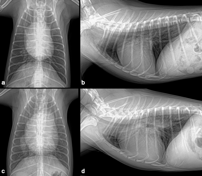 Fig. 3. Thoracic radiographs. When compared with preoperative images (a, b), generalized cardiomegaly was observed at one year after the operation (c, d).