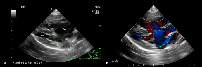 Fig. 4. Echocardiography (right parasternal long-axis four-chamber view) showed an atrial septal defect (a) and color Doppler revealed a right-to-left shunt (b). DiscussionThe present study described a dog with two types of vascular anomalies. Similar to a previous study (Greenhalgh et al., 2010), the dog showed a good prognosis after surgical attenuation of the CPSS. Cardiomegaly was not seen on preoperative thoracic radiographs, despite the fact that ASD was suspected at the time of CPSS diagnosis. ASD is generally a well-compensated disease (Chetboul et al., 2006) and the dog may show no clinical symptoms over 2 years. When it was presented 1 year after the operation, the chief complaint was exercise intolerance of the dog. Compared with the previous clinical data on the dog, it could be suspected that ASD caused pulmonary hypertension, which might have resulted in a right-to-left shunt (Guglielmini et al., 2002). This hemodynamic physiology is generally defined as Eisenmenger’s syndrome, which can cause cyanosis and exercise intolerance (Berger et al., 2010). In veterinary medicine, surgical treatment for ASD is challenging for small-sized dogs (Pelosi et al., 2013). Although a case of ASD closure in a toy poodle was recently published (Sugimoto et al., 2020), owing to the dog's pulmonary hypertension and reversed interatrial shunt, surgical and interventional therapy for the dog was not explored in the current investigation. Surgical treatment for Eisenmenger’s syndrome, such as heart-lung transplantation, has been performed in human medicine. However, its morbidity and mortality remain high (Waddell et al., 2002). As an alternative to surgical treatment, medical management by sildenafil can be effectively applied to patients with this condition (Garg et al., 2011). The dog in the present study also responded well to sildenafil, and its clinical symptoms were resolved. In previous human medicine studies, about 9% to 30% of patients have CPSS concurrent with ASD (Franchi-Abella et al., 2010; Kim et al., 2012). Like human medicine, this study reports a rare case of CPSS concurrent with ASD in a dog. Because congenital heart illnesses are easily recognized by echocardiography, it is also suggested for dogs with CPSS to get an echocardiogram for early detection of additional cardiovascular defects, even if there are no symptoms. Conflict of interestThe authors declare that there is no conflict of interest. Authors’ contributionsAll authors contributed to the study and approved the final manuscript. ReferencesBerger, R.M.F., Beghetti, M., Galiè, N., Gatzoulis, M.A., Granton, J., Lauer, A., Chiossi, E. and Landzberg, M. 2010. Atrial septal defects versus ventricular septal defects in BREATHE-5, a placebo-controlled study of pulmonary arterial hypertension related to Eisenmenger’s syndrome: a subgroup analysis. Int. J. Cardiol. 144, 373–378. Chetboul, V., Charles, V., Nicolle, A., Sampedrano, C.C., Gouni, V., Pouchelon, J.L. and Tissier, R. 2006. Retrospective study of 156 atrial septal defects in dogs and cats (2001–2005). J. Vet. A Physiol. Pathol. Clin. Med. 53, 179–184. Franchi-Abella, S., Branchereau, S., Lambert, V., Fabre, M., Steimberg, C., Losay, J., Riou, J.Y., Pariente, D., Gauthier, F., Jacquemin, E. and Bernard, O. 2010. Complications of congenital portosystemic shunts in children: therapeutic options and outcomes. J. Pediatr. Gastroenterol. Nutr. 51, 322–330. Garg, N., Tripathy, N. and Sinha, N. 2011. Comparative efficacy of sildenafil in Eisenmenger’s syndrome secondary to atrial septal defect versus ventricular septal defect: a cardiac catheterisation follow-up study. Cardiol. Young. 21, 631–638. Gordon, S.G., Nelson, D.A., Achen, S.E., Miller, M.M., Roland, R.M., Saunders, A.B. and Drourr, L.T. 2010. Open heart closure of an atrial septal defect by use of an atrial septal occluder in a dog. J. Am. Vet. Med. Assoc. 236, 434–439. Greenhalgh, S.N., Dunning, M.D., McKinley, T.J., Goodfellow, M.R., Kelman, K.R., Freitag, T., O’Neill, E.J., Hall, E.J., Watson, P.J. and Jeffery, N.D. 2010. Comparison of survival after surgical or medical treatment in dogs with a congenital portosystemic shunt. J. Am. Vet. Med. Assoc. 236, 1215–1220. Guglielmini, C., Diana, A., Pietra, M. and Cipone, M. 2002. Atrial septal defect in five dogs. J. Small Anim. Pract. 43, 317–322. Kim, M.J., Ko, J.S., Seo, J.K., Yang, H.R., Chang, J.Y., Kim, G.B., Cheon, J.E. and Kim, W.S. 2012. Clinical features of congenital portosystemic shunt in children. Eur. J. Pediatr. 171, 395–400. Pelosi, A., Anderson, L.K., Paugh, J., Robinson, S. and Eyster, G.E. 2013. Challenges of cardiopulmonary bypass-a review of the veterinary literature. Vet. Surg. 42, 119–136. Sanders, R.A., Hogan, D.F., Green III, H.W., Hoyer, M.H. and Puppel, D.A. 2005. Transcatheter closure of an atrial septal defect in a dog. J. Am. Vet. Med. Assoc. 227, 430–434. Sugimoto, K., Mochizuki, Y., Kanda, T., Ohnishi, A., Miyabe, M., Wada, Y., Kochi, M. and Aoki, T. 2020. Atrial septal defect closure in a midget toy poodle. Open Vet. J. 10, 11–15. Tidholm, A. 1997. Retrospective study of congenital heart defects in 151 dogs. J. Small Anim. Pract. 38, 94–98. Waddell, T.K., Bennett, L., Kennedy, R., Todd, T.R.J. and Keshavjee, S.H. 2002. Heart-lung or lung transplantation for Eisenmenger syndrome. J. Heart Lung Transplant. 21, 731–737. Worley, D.R. and Holt, D.E. 2008. Clinical outcome of congenital extrahepatic portosystemic shunt attenuation in dogs aged five years and older: 17 cases (1992–2005). J. Am. Vet. Med. Assoc. 232, 722–727. | ||