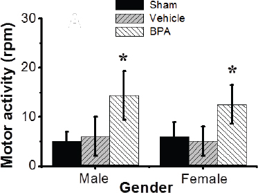 Fig. 1. Effects of BPA exposure on neurobehavioral performance. Motor behavior in males and females exposed to control or BPA conditions. Data are shown as mean ± SEM (n=12 per group). *Significant differences from same sex control (p ≤ 0.05) by Dunnett’s multiple comparison test.