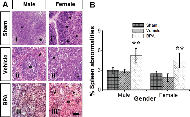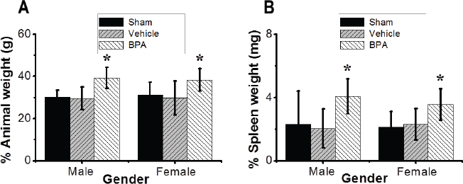 Fig. 2. Effects of BPA exposure on body and spleen weights. (A) Animal body weight of males and females exposed to control or BPA conditions. (B) Spleen weight of adult males and females exposed to control or BPA conditions. Data are shown as mean ± SEM (n=12 per group). *Significantly different from same sex control (p ≤ 0.05) by Dunnett’s multiple comparison test. Additionally, a histiocytosis was represented by a focal replacement of the red pulp and parts of the white pulp, by increased macrophage counts. Multifocal erythrocytes extravasation and multiple hemosiderosis were detected in the red pulp (Fig. 4A, panels ii and iii). There were also apoptotic changes in the germinal centers of the white pulp. In addition, the walls of the central arterioles were ruptured and showed increasingly narrow lumens. Furthermore, quantitative analysis showed a statistically significant increase in spleen abnormalities in BPA-exposed mice compared to the control group (Fig. 4B). There were no differences in the microanatomical structure between males and females in all mice groups.