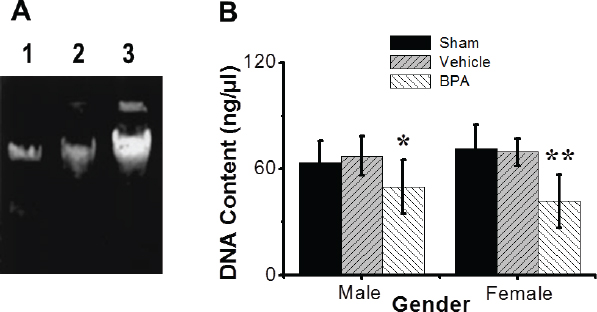 Fig. 5. Effects of BPA exposures on DNA biomarkers (quality and integrity) of splenic tissues. (A) Agarose gel electrophoresis of DNA isolated from splenic tissues of the male and female control and BPA-treated groups. Lane 1, sham control group; lane 2, vehicle control group; and lane 3, BPA-treated group. Almost no DNA degradation was detected in controls. (B) Quantification of DNA concentration. DNA content (ng/μl) was examined with mean ± SEM presented (n=12 per group). *Significantly different from same sex control (p ≤ 0.05) by Dunnett’s multiple comparison test.