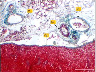 Fig. 4. Microphotograph shows splenic vein (Sv), splenic artery (Sa), and capsule (Cp). Masson’s Trichrome stain (Scale bar=300 µm). The present study found that the spleen of the hamster fixed to the neighboring organs with two ligaments: the gastro-splenic and splenorenal ligaments; in mice, Kaufman and Bard (2000) mentioned that the spleen set with two ligaments: gastro-splenic ligament, which joins the spleen with the greater curvature of the stomach, and splenorenal ligament joins the spleen with left kidney, which is similar to our observations, In compare to other laboratory animals, Qasem et al. (2015) recorded that rabbits’ spleen fixed with gastro-splenic ligament only, while the guinea pigs’ spleen set with three broad ligaments (gastrosplenic, splenophrenic and splenorenal ligaments) connect the spleen with the stomach, diaphragm and left kidney. The differences in ligaments depend on the size of the digestive system and how far it extends inside the abdominal cavity. The morphological measurements of the spleen in hamsters differed from the authors' observations, attributing those differences to the animals’ size, relative weight, and shape of the spleen. The spleen of hamster is shorter compared to the spleen of rabbits and rats, Dimitrov (2012) and Voloshin et al. (2014) mentioned that the length of the spleen in rabbits and adult albino rats was 33.3 and 49.8 mm, respectively, while it was longer than mice and guinea pig spleen. Uwah et al. (2021) and Qasem et al. (2015) noted that the length of guinea pigs' spleen was 24.5 cm, and mice's spleen length was 18.1 mm.