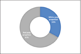 Fig. 10. Chart shows the proportions of white and red pulp in the spleen of an adult golden hamster. In the current study, the thickness measurement of the splenic capsule in hamsters was close to the laboratory animals, Rahman et al. (2016) reported that the mean thickness of the rabbit capsule was 33.3 µm, while in mice was less than (25 µm) according to Mubaraki et al. (2016). Moreover, the splenic trabeculae of hamsters were long extended deep into the parenchyma composed of fibrous tissue, smooth muscle fibers, arteries, and veins, equivalent descriptions presented by (Cesta, 2006) in mice and rats. Rahman et al. (2016) also mentioned similar details in rabbits and found that the thickness of trabeculae was 30 µm. The red pulp of splenic parenchyma constituted a network of splenic cords and splenic sinusoids in hamsters, Haley (2017) reported that the spleen in minipigs and mice was non-sinusoidal, the sinusoids very small and lacked lining endothelial cells, attribute these differences to the poor development of sinuses and the functional hemopoietic activity of spleen that extend throughout life in compare to rats and rabbits. While Cesta (2006), Rahmuon et al. (2019), and Maynard and Downes (2019) adverted that the spleen had large true sinusoids lined with elongated endothelial cells and loose connective tissue in laboratory animals and humans, which is like what is seen in hamster’ spleen in our line of works. The white pulp in the spleen of hamsters was composed of the lymphoid follicles and the PALS, the strands comprised lymphocytes aggregations arranged into the mantle and marginal zones; Haley (2017) reported that follicles in minipigs were small, ellipsoid, and less distinct compared to rodents but the PALS in minipigs were well developed surrounding the capillaries that arise from white pulp artery. The follicle edges attached or separated from PALS in rats while it’s studded within follicles in mice (Steiniger, 2015), which agrees with our observations in hamster, Steiniger (2015) also found that white pulp follicles area per tissue in mice were higher than in human. Still, the number of follicles among rodents does not differ. Ward (1999) also found that the marginal zone and PALS in rat and mice were delineated, like those of hamster’ spleen, but it is less distinct in human; it is believed that the arrangement and the number of lymphoid follicles has a relationship with splenic size and the ratio of white to the red pulp. In this paper, the white pulp follicle in golden hamster was a bit smaller than in rats and rabbits, Rahman et al. (2016) noticed that the diameter of splenic white pulp in rabbits and rats were (342.6 µm) and (295 µm), and Ward (1999) found that white pulp proportion in mice tends to be greater than in rats. Still, the follicle was smaller, rats’ white pulp to red pulp proportion was (28%) to (72%), which is closer to the balance in the spleen of the hamster. The examination of the spleens’ histochemistry revealed an intense reaction to PAS stain in capsules, trabecula. At the wall of splenic blood vessels, these findings were parallel to those (Gautam and Mishra, 2015, Kaur et al., 2022) mentioned that glycoprotein components in these structures were high. It’s necessary for the physiological function and development of the spleen. Gautam and Mishra (2015) reported that red pulp in the spleen of goats showed weak or moderate activity to AB stain, similar to our findings in hamsters, and mentioned that intensity increases with age advancement. This study has a limitation in its scope of examination, as it only covers a subset of morphological parameters, particularly at the cellular level, and does not incorporate the use of other histochemical markers. In addition, the study lacks information on the experimental manipulation's developmental and morphological impact. These may limit the generalizability of the results and conclusions to other developmental age stages. Therefore, it is recommended that future studies include a more comprehensive range of morphological parameters and additional biochemical markers, as well as examination across multiple animal models and different age groups, to enhance the understanding of the overall splenic structure. Table 3. The proportions components of the splenic parenchyma in the adult golden hamster.