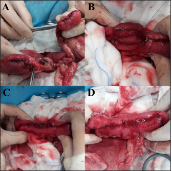 Fig. 1. Main steps of SSA technique. (A): Intestinal stumps closed in two layers with continuous apposition suture pattern followed by the interrupted inverting pattern with monofilament absorbable material. (B): Stumps overlapped with incisions made at the antimesenteric side of both parts. (C): Incision edges juxtaposed with an inverting suture for the seromuscular layers and a continuous appositional layer for the submucosa and mucosa with monofilament absorbable material. (D): Final appearance of the anastomosis after juxtaposition of the seromuscular layers on the residual edge with inverting suture pattern. Postoperative careAll the patients were then hospitalized in the intensive care unit (ICU) for at least 24 hours postoperatively. Analgesia was ensured through opioids [methadone (Semfortan®; Dechra Veterinary Products, Bladel, Netherlands) 0.1–0.2 mg/kg IV q 4 hours, buprenorphine (Temgesic; Indivior Italia S.r.l, Milano, Italy) 10–15 µg/kg IV q 6–8 hours]. Administration of fluid therapy, proton-pump inhibitors, prokinetics, inotropes or vasopressors, and other medications were administered at the discretion of the surgeon and intensivist. US abdominal rechecks and blood exams were performed routinely during the postoperative course. Complications were categorized as intraoperative and postoperative. Postoperative complications were classified as short-term complications, that occurred within one month from surgery, or long-term complications, if they took place more than one month after surgery. Complications were also classified as minor, if responsive to medical therapy, or major, if they required surgical revision or led the patient to death or euthanasia. The follow-up time was calculated as the number of days from the surgery to the patient death or the last clinical recheck. Development of postoperative septic peritonitis was suspected either by clinical, clinic-pathological, or indirect signs at US reassessment, confirmed by cytology of the abdominal effusion and/or bacterial culture. Statistical analysisCollected data were analyzed through medical statistical software (MedCalc®; MedCalc Software Ltd, Ostend, Belgium). Continuous variables were analyzed with the D’Agostino-Pearson test for normality, all summarized by using median and range, while categorical data were described with frequencies and percentages. Fisher exact test was used to compare categorical variables, while the Mann-Whitney U test was performed to confront categorical and continuous data. Statistical significance was set at p ≤ 0.05. Ethical approvalAll patients included in this study were clinically managed according to contemporary standards of care. Informed consent was obtained from pet owners. ResultsEpidemiological data and reason for surgical interventionFifty-two dogs and 16 cats were included. Mixed-breed dogs were the most frequent (16/52), followed by Labrador Retriever (4/52), Boxer (3/52), German Shepherd (3/52), Dachshund (2/52), Dobermann (2/52), Golden Retriever (2/52), Épagneul Breton (2/52), West Highland White Terrier (2/52) and one of each (1/52) of Akita Inu, American Bulldog, American Staffordshire Terrier, Cavalier King Charles Spaniel, Deutscher Drahthaar, English Setter, Flat Coated Retriever, Italian Corso, Maremma Hound, Pomeranian dog, Pug, Rottweiler, Shar-pei, Shi-tzu, Standard Poodle, Swiss Shepherd Dog. The most frequent feline breed was the Domestic shorthair (13/16), followed by Main Coon (2/16) and Siberian (1/16). There were 24/52 male dogs (6/24 neutered) and 28/52 female dogs (16/28 spayed). Seven cats were male (5/7 neutered), and 9/16 were female (7/9 sterilized). The median age was 7 years (range: 1–15 years) for dogs and 6 years (range: 1–15 years) for cats, while the median weight was 17.9 kg (range 3.1–54 kg) for dogs and 4 kg (range: 1.9–6 kg) for cats. Most of the animals included were scheduled for exploratory laparotomy due to intestinal mass (18/52 dogs, 9/16 cats), or they underwent intestinal resection and anastomosis due to vascular damage or bowel wall necrosis caused by foreign body ingestion and occlusion (14/52 dogs, 2/16 cats). Other reasons for surgical intervention were bowel intussusception (8/52 dogs, 2/16 cats), traumatic intestinal lesions (5/52 dogs, 2/16 cats), intestinal herniation with subsequent occlusion (3/52 dogs), volvulus (3/52 dogs), strangulation (1/52 dogs), or stenosis (1/16 cats). There were no differences in terms of breed, gender, age, weight, or reason for enterectomy between the EEA and SSA groups in both species. Preoperative work upIn 48/52 dogs, the unstable clinical condition required hospitalization in the ICU prior to emergency surgical intervention. Four dogs were submitted to elective surgery in 2–5 days (median: 4 days) after the first presentation. Conversely, only 2/16 cats were submitted to emergency surgery in unstable clinical conditions. No difference was found in terms of preoperative clinical conditions between the EEA and SSA groups. Preoperative blood sample results frequently showed hypoproteinemia and hypoalbuminemia in dogs and moderate neutrophilic leukocytosis in cats (Table 1). Moreover, when evaluated, the increase in C-reactive protein and serum amyloid A levels was observed in dogs and cats (Table 1). Preoperative diagnostic imaging was performed in all dogs and cats. US assessment was often used as a unique diagnostic technique (40/52 dogs, 14/16 cats) and eventually combined with radiographic evaluation (8/52 dogs, 2/16 cats). Radiographic examination alone was performed in 12/52 dogs. In addition, US-guided sampling of the peritoneal effusion was performed for cytology and bacterial culture in 10/52 dogs and one cat (1/16). Preoperative septic peritonitis, confirmed by positive bacterial culture, was detected in 9/52 dogs, distributed between EEA (6/9) and SSA (3/9) groups. Escherichia coli was the most frequently isolated bacteria (6/9), alone (4/9), or in associ