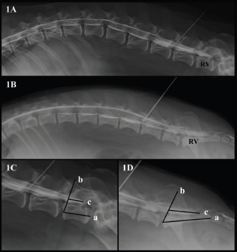Fig. 1. (A). Canine lateral myelographic image where DS ends before the LS space. (B) Lateral myelographic image where the DS ends after LS space. (C) Measurement method used for the RV and DS ending where L7 was considered the RV. Line a=RV measurement. Line b=starting point for DS measurement. Line c=DS measurement. (D) Measurement method used for RV and the DS ending where the sacrum was considered the RV. Line a=RV measurement, Line b=starting point for the DS measurement. Line c=DS measurement. Lastly, the LS space was identified as the intervertebral disc space between the last lumbar vertebrae and the first sacral vertebrae. The observers were asked to assess the possibility of accidental subarachnoid puncture during LS epidural injection (yes/no), based on where the DS ended: before the LS space, at the LS space or after the LS space. Table 1. Summary of the RV and position of the dural sac identified by myelography in dogs and its relation to body weight category.