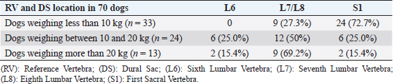 AbstractBackground: The techniques described for the identification of the lumbosacral (LS) epidural space in dogs do not guarantee the needle position or an accidental subarachnoid puncture, especially in small size dogs. Aim: To determine the relationship between body weight and the location of the dural sac (DS) using myelography in dogs, and to determine the possibility of subarachnoid puncture during LS epidural based on the position of the DS. Methods: Four masked observers evaluated 70 myelographic studies of dogs, annotating the vertebrae where the DS ended, if it was localized before or after the LS space, and if accidental subarachnoid puncture during LS epidural injection was possible (yes/no). Body weight (kg) was categorized into: less than 10 kg, between 10 and 20 kg, and more than 20 kg and was also converted to body surface area (BSA) as a continuous variable. Results: The DS ended at the LS space or caudally in 50% of dogs. There was a statistically significant difference between the position of the DS and the dog’s BSA (p=0.001). The DS ended caudal to the LS space in 72.7% of dogs weighing <10 kg, in 25% of dogs between 10 and 20 kg and in 15% of dogs in the >20 kg category. The observers considered a possible subarachnoid puncture during LS epidural in 69.7% of patients <10 kg, 16.6% on those between 10 and 20 kg, and in 11.7% of the dogs >20 kg. Conclusion: The DS ended caudal to the LS space in almost 3/4 dogs in the <10 kg category, so accidental subarachnoid puncture during LS epidural is highly possible in this weight range. Keywords: Body weight, Dog, Dural sac, Lumbosacral epidural, Myelography. IntroductionEpidural drug administration is a loco-regional technique broadly used in veterinary anaesthesia because is relatively easy to perform with a low rate of complications (Campoy et al., 2015; Garcia-Pereira, 2018). It can decrease the adverse effects of general anaesthetics by reducing their dose requirements as well as intraoperative and postoperative opioid consumption for thoracic, abdominal, hind limb, and perineal surgeries (Garcia-Pereira, 2018). The most commonly used drugs for epidural administration in small animals are local anaesthetics either alone or mixed with other analgesics, such as opioids, alpha-2 agonists, or ketamine to provide multimodal analgesia (Duke-Novakovski, 2016). The epidural space is a virtual space within the spinal canal between the duramater and the periosteum, occupied by nerve roots, adipose tissue, and venous plexus (Jones, 2001). In dogs, the lumbosacral (LS) space is generally the preferred site of injection for epidural drug administration due to the easy identification of anatomical landmarks and low risk of spinal cord damage (Duke-Novakovski, 2016). The epidural injection can be performed with the patient in lateral or sternal recumbence, normally with the pelvic limbs extended in forward direction. The iliac crests, the spinous process of the last lumbar vertebra, and the first sacral vertebra, are the anatomical landmarks to identify the LS space. The needle is carefully advanced through the subcutaneous tissue, muscle layers, and ligamentum flavum into the vertebral canal (Duke-Novakovski, 2016). The techniques described for correct identification of the epidural space include pop sensation, hanging drop, loss of resistance, modified Baraka technique, radiography, contrast radiography, nerve stimulation, and ultrasound guidance (Garcia-Pereira, 2018), but they do not guarantee the position of the needle or the avoidance of the subarachnoid space, possibly leading to an unnoticed intrathecal or spinal injection instead of epidural technique (Otero et al., 2014; Adami and Gendron, 2017). The veterinary literature describes that the spinal cord ends approximately at the 6th or 7th lumbar vertebrae in dogs (Campoy et al., 2015; Otero and Portela, 2017). The spinal cord terminates forming the Conus medullaris (CM) (Garosi, 2012) surrounded by cerebrospinal fluid (CSF) within the dural sac (DS). The DS is continued by a filament, which attaches it to a sacral or a caudal vertebra (Fletcher, 2013). Some veterinary studies showed a relationship between the size of the dog and the spinal cord termination in the CM, extending approximately to the L6 vertebral body in most large breed dogs and the L7 vertebral body in small breed dogs (Morgan et al., 1987). However, there is controversy in the veterinary literature regarding the location of the DS in dogs. The aims of this study were to describe the position of the DS using myelography in dogs and determine if there is a relationship between the body weight and the location of the DS. The second aim is to study the risk of subarachnoid puncture during LS epidural in dogs, based on the position of the DS. Our hypothesis is that in small breed dogs the DS ending will reach the first sacral vertebra, thus increasing the risk of accidental puncture of the subarachnoid space during the LS epidural. Materials and MethodsAnimals’ criteriaThe study design was a retrospective cohort study including myelographies of canine patients with acute onset of spinal cord dysfunction. The medical records of Veterinary Hospital of Catholic University of Valencia San Vicente Mártir were reviewed and all canine myelographies between December 2015 and May 2019 were selected. Exclusion criteria were incomplete patient records, cases on which contrast radiographies did not include the DS or if the vertebra where the DS ended was not completely visualized on the radiographs. Clinical informationThe following parameters were recorded from patient’s medical records: gender, body weight (kg), age and breed, number of lumbar vertebrae, location of the lumbar puncture, and the presence or absence of spinal cord compression. To facilitate statistical analyses, body weight was converted to body surface area (BSA) using the following formula: BSA (m2)=0.101 × [(body weight in kg) ⅔] (Plumb, 2011). 