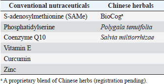 AbstractBackground: Canine cognitive dysfunction (CCD), the dog analog of human Alzheimer’s disease (AD), is a progressive neurodegenerative condition that presents many treatment challenges. There are few effective drugs with acceptable side effects for AD/CCD, which has prompted investigation into non-drug options, collectively termed nutraceuticals. Nutraceutical supplements are conceptually divided into conventional (Western) and non-conventional (Eastern) ingredients. Many of these individual supplements have shown in vitro and/or in vivo efficacy in ameliorating neuronal damage in rodent models, and some have demonstrated positive effects on cognition in rodent models and clinical trials in dogs and humans with cognitive impairment. Aim: The purpose of this open-label clinical trial was to investigate the effect of an oral integrative (combination of conventional nutraceuticals and Chinese herbals) supplement (CogniCaps®) on cognitive scores when administered to aging dogs with CCD over a 2-month period. Methods: Ten aging (>9-year-old) dogs with moderate (16–33) cognitive scores were recruited and administered oral CogniCaps® for two months. No additional drugs or nutraceuticals directed at improving cognitive function were allowed during the study period. Baseline cognitive scores were compared with those procured at 30 and 60 days. Cognitive scores for baseline, 30- and 60-days post-treatment were compared. Results: Cognitive scores improved at 30 days (38% reduction) and 60 days (41% reduction) post-treatment (p=0.002). Scores did not differ between 30- and 60-day assessments (p=0.7). Conclusion: The results of this small preliminary study suggest that the integrative supplement CogniCaps® might improve cognitive scores in dogs with CCD within the first 30 days of administration and that this improvement is sustained at 60-day follow up. Keywords: Canine, Cognitive, Alzheimer’s, Integrative, Supplement. IntroductionCanine cognitive dysfunction (CCD) is the canine analog of human Alzheimer’s disease (AD); both disorders are characterized by progressive cognitive decline and a host of pathophysiological aberrations that cause dysfunction of brain neurons and supporting cells. These aberrations are multifactorial and interrelated and include the following: oxidative and inflammatory neuronal damage; excitotoxic neuronal damage; brain vascular compromise; neuronal mitochondrial dysfunction; deposition of toxic beta-amyloid (Aβ) and tau protein around neurons and blood vessels; premature neuronal death (apoptosis); decline of brain cholinergic activity; and impaired neurogenesis (Landsberg et al., 2012; Chapagain et al., 2018; Dewey et al., 2019). The lack of safe and effective drugs for AD/CCD has prompted investigation into non-drug therapies to ameliorate cognitive decline, including nutraceuticals. Nutraceuticals comprise a wide variety of non-drug supplements and contain conventional (Western) and non-conventional (Eastern) ingredients. This conceptual division between conventional and non-conventional nutraceuticals is somewhat arbitrary and vague, with some previously considered non-conventional supplements having become standard (conventional) therapy as proof of efficacy has accumulated (Libro et al., 2016; Tewari et al., 2018; Makkar et al., 2020). There are numerous conventional and non-conventional (mainly Chinese herbal) individual nutraceutical supplements that have demonstrated beneficial effects against AD/CCD pathologic processes in vitro and in vivo; some of these supplements have also exhibited efficacy in rodent AD models and clinical trials in humans with AD (Yang et al., 2009; Chang et al., 2016; Libro et al., 2016; Jiang et al., 2017; Tewari et al., 2018; Makkar et al., 2020; Bednarikova et al., 2021; Zhou et al., 2022). For many of the Chinese herbals used for cognitive impairment, the active molecular compounds and their biochemical pathways of action have been elucidated (Yang et al., 2009; Chang et al., 2016; Jiang et al., 2017; Tewari et al., 2018; Bednarikova et al., 2021; Zhou et al., 2022). Cognicaps® is an integrative (combination of conventional nutraceuticals and Chinese herbals) supplement for CCD formulated by one of the authors (CD). Each individual ingredient was selected based on evidence of efficacy (research model and/or clinical trial) and tolerability (low incidence of adverse effects). The active ingredients are listed in Table 1. The purpose of this preliminary open-label clinical trial was to evaluate CogniCaps® in aging dogs with moderate cognitive impairment by comparing baseline cognitive questionnaire scores at 30- and 60-days post-supplement institution with baseline scores. We hypothesized that dogs would experience significant (p < 0.05) improvement in cognitive scores after treatment with the integrative supplement. Table 1. Active ingredients in CogniCaps® supplement.