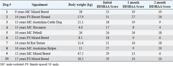 Table 2. DISHAA (Disorientation; Interactions-social; Sleep/wake cycle; House soiling, learning and memory; Activity; and Anxiety) scoring system used to assess cognitive ability in dogs. Each subcategory (bullet point) is scored as: 0=none, 1=mild, 2=moderate, and 3=severe. Total scores are assessed as: 4–15=mild impairment, 16–33=moderate impairment, >33=severe impairment.