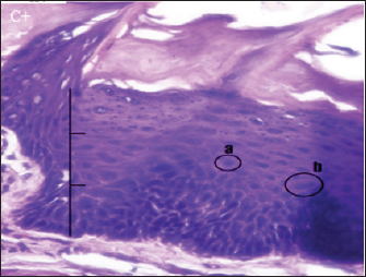Fig. 1. Histopathological description of the rat tongue epithelium in the positive control group (C+), microscope at ×400. (a) Hyperchromatic nucleus; (b) the size of the nucleus increases so that the ratio between the nucleus and the cytoplasm increases.