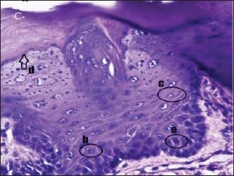 Fig. 2. Histopathologically described the rat tongue epithelium in the negative control group (C-), microscope at ×400. (a) basal layer with a hyperchromatic nucleus and basophilic cytoplasm; (b) spinosum layer with cells of irregular polygonal shape; (c) cells in the granulosum layer with oval cell shape; d. the layer of corneum filled with keratin. Ki-67 is a biological marker for cancer risk (Hutagalung et al., 2014), cancer grading, and prognostic evaluation (Takkem et al., 2018). The results showed that the expression of Ki-67 in the positive control (56.75 ± 1.79) was significantly higher than in the negative control (9.65 ± 0.81) and in all treatment groups (T1, T2, and T3) significantly. The expression of Ki-67 in treatment T1 (45.125 ± 3.66) was significantly higher than in T2 (25.025 ± 3.18) and T3 (16.4 ± 1.92). The higher the extract dose, the lower the Ki-67 expression (Fig. 6). DiscussionDMBA effectThis study used the carcinogenic DMBA to induce the OSCC animal model. Domestic animal OSCC resembles human OSCC in many aspects (Sharma et al., 2021), such as etiopathogenesis, molecular markers, tumor biology, clinical symptoms, treatment, and prognosis so that the inducer or cell culture used may be the same (Rathore et al., 2014). DMBA is a model oral carcinogen because neoplastic alterations are morphologically and histologically similar to those found in human oral carcinoma (Ribeiro et al., 2015). The induction of DMBA causes the body to produce free radicals causing damage to DNA, cell membranes, and proteins and dysregulation of anti-apoptotic mediators (Barroso et al., 2017). DMBA also causes keratinocyte cells to undergo genetic changes, resulting in changes in cell cycle development, DNA repair mechanisms, and apoptosis (Chen et al., 2020). On the basis of clinical examination, DMBA-induced rats in the positive control and treatment groups (T1, T2, and T3) exhibited symptoms of OSCC on the tongue in the form of white plaques or elevations (leukoplakia). The clinical manifestations of OSCC originate from leukoplakia cells (pre-malignant cells). According to Takkem et al. (2018), OSCC symptoms include ulcers with broken or elevated borders, lumps, reddish lesions (erythroplakia), white lesions (leukoplakia), or a combination of both lesions (Rivera and Venegas, 2014). Moreover, lesions may be non-healing extraction sockets or swollen cervical lymph nodes (Markopoulos, 2012).