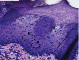 Fig. 3. Histopathological description of the rat tongue epithelium in the T1 group, microscope at ×400. (a) the ratio between the nucleus and the cytoplasm increases, with a hyperchromatic nucleus; (b) the shape of the nucleus showing anisonucleus.