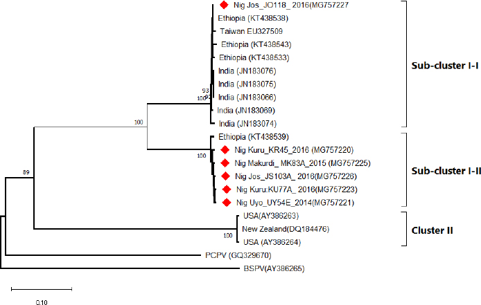 Fig. 3. The Phylogenic tree of A32L gene of the ORFV samples collected from outbreaks in Nigeria. The Nigerian ORFV samples are marked with red. The tree was constructed using the Neighbor-joining method at 500 bootstrap.