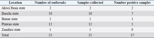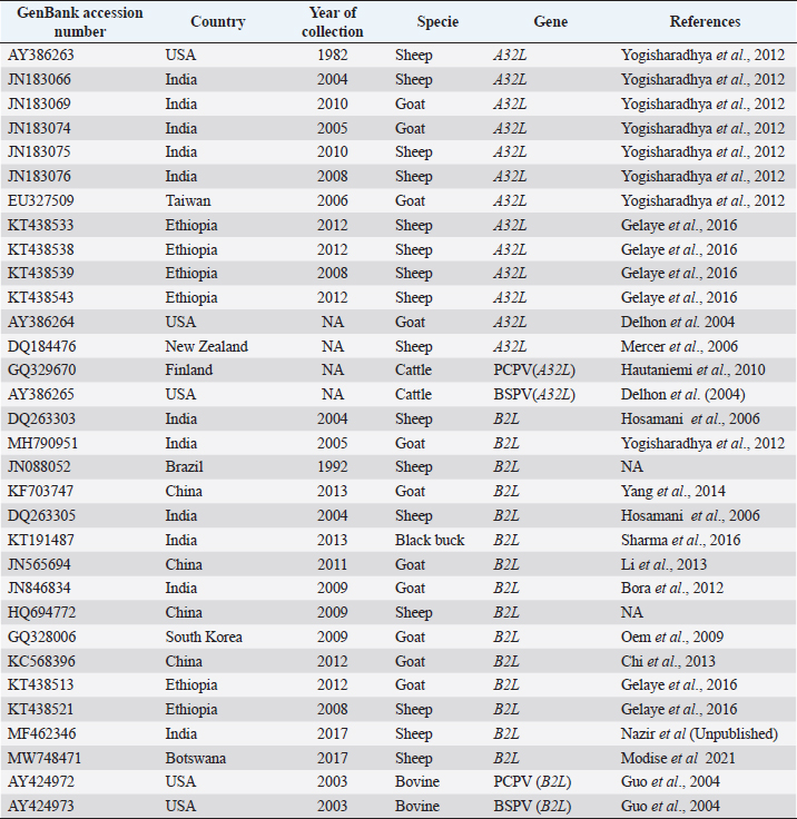 AbstractBackground: Outbreaks of contagious ecthyma (CE) are frequently reported in sheep and goat flocks in Nigeria with severe clinical outcomes. CE is a debilitating and economically important disease primarily affecting sheep and goats caused by the Orf virus (ORFV). Despite field reports of CE in the country, there is no concise country-wide epidemiological data on the disease and limited genetic data of circulating Nigerian ORFV are available in the public domain. Aim: An epidemiological survey of CE and molecular characterization of ORFV circulating in Nigeria from 2014 to 2016. Method: Data were collected using designed questionnaires, administered to veterinarians and farmers in selected States of Nigeria. Samples were collected during passive surveillance for CE from 2014 to 2016 which were analyzed by polymerase chain reaction (PCR). The A32L and B2L genes of circulating ORFV were also characterized. Results: Analysis of the questionnaire showed that 69.54% (n =82/118) of the farmers claimed to have experienced CE in their flocks with average morbidity and mortality rates of 25% and 15%, respectively. A total of 113 veterinarians participated in the study, with 69.9% (n =79) familiar with CE and claimed CE causes morbidity rates of 25%–37% and mortality rates of 10%–15% in sheep and goats. Laboratory results revealed that ORFV was detected in 72% (18/25) of outbreak samples analyzed by real-time PCR. Phylogenetic analysis of A32L and B2L genes revealed that Nigerian ORFV sequences belong to clusters I and II and are similar to viruses from India, Ethiopia, and China. Conclusions: This study is the first nationwide epidemiological data on the status of CE in sheep and goats in Nigeria. It is also the first report of molecular characterization of two genes of ORFV circulating and causing outbreaks in small ruminants in the country. This study showed that CE is under-reported, widespread and of economic importance to sheep and goat farmers in Nigeria. Keywords: A32L gene, B2L gene, Contagious ecthyma, Orf virus, Small ruminants. IntroductionContagious ecthyma (CE) or Orf is a debilitating and economically important disease of sheep and goats caused by the epitheliotropic Orf virus (ORFV) a member of the genus Parapoxvirus and family Poxviridae (Spyrou and Valiakos, 2015). The ORFV primarily affects sheep and goats but has been reported in cattle, camels, and wild animals (Nandi et al., 2011; Adedeji et al., 2018a; Şevik, 2019). The genome of ORFV is linear double-stranded DNA with an estimated size of 134–139kb and it is the smallest member within the subfamily Chordopoxvirinae (Friederichs et al., 2014). Genetically, the A32L and B2L genes encode highly conserved segments of the ORFV, which have been used for detection and phylogenetic studies of the virus (Chan et al., 2009). The A32L gene of ORFV encodes an ATPase that mediates virion DNA packaging, while the envelope gene (B2L) is the highly immunogenic protein of the virus (Gelaye et al., 2016). CE is a zoonotic disease and occupational hazard to farmers, butchers, and veterinarians handling livestock (Essbauer et al., 2010; Veraldi et al., 2019; Andreani et al., 2019). Clinically, the disease is characterized by fever, papules, pustules, and thick tenacious scabs at oral commissures, lips, mouth, nose, ears, legs, genital region, and udders (Nandi et al., 2011). These skin lesions become ulcerative and painful, with the affected animals unable to either feed or walk, leading to weight loss and reduced productivity (Bala et al., 2018). However, CE is also characterized by high morbidity and low mortality, but, in young animals, mortality is high due to the inability to suckle (Windsor et al., 2017). ORFV is transmitted by contact through damaged skin during grazing and abrasions developed on the lips, nostrils, and mouth caused by dried feeds or plants (Spyrou and Valiakos, 2015). The ORFV is distributed worldwide, particularly in sheep and goat-producing countries (Nandi et al., 2011; Bala et al., 2018). Diagnosis of CE is based on clinical signs and laboratory techniques such as electron microscopy, viral isolation, and molecular assays (Torfason and Guðnadóttir, 2002; Kottaridi et al., 2006; Chan et al., 2009). Since the first report of CE in Nigeria in 1978, reported outbreaks of the disease have resulted in economic losses to sheep and goat farmers in the country (Odo, 2003; Adedeji et al., 2018b). Despite, reports of CE outbreaks in some parts of Nigeria with varying economic losses (Adedeji et al., 2017; Ifende et al., 2019). There is a paucity of epidemiological data on the disease nationally and limited genetic sequences of the circulating ORFV in Nigeria are available in the public domain. Albeit, only one sequence from one gene of ORFV circulating in Nigerian small ruminants flock has been deposited in the public domain or reported (Lawal et al., 2021). Therefore, an epidemiological survey was carried out to determine the status of CE in Nigeria and characterized the circulating ORFV causing outbreaks. Materials and MethodsStudy areaNigeria is located in West Africa and divided into 36 states. There are five major agro-ecological zones in the country consisting of humid (rainforest), sub-humid (southern Guinea savannah, Northern Guinea Savannah), semi-arid (Sudan Savannah), and arid (Sahel Savannah) zones (Fadiga et al., 2013). There are two main climatic seasons in Nigeria, namely; Rainy season (May to September) and dry season (October to April). The rainy season extends to October-December in the southern coastal states of the country (Fadiga et al., 2013). Nigeria has a population of 42 million sheep and 73 million goats (Bolajoko et al., 2019). Keeping sheep and goats is an integral part of the lives of rural households in Nigeria. These animals are kept for food, source of income, and religious purposes and serve as “bank” for saving money (Bolajoko et al., 2019). Most of the sheep and goats in 