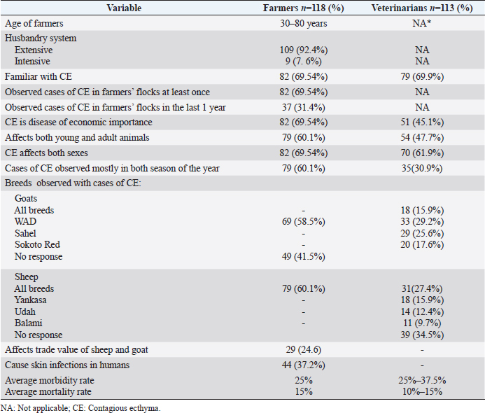 Ethical approvalThis study was approved by National Veterinary Research Institute Animal Ethics Committee (AEC/03/58/18). ResultsQuestionnaire data analysisSheep and goats farmers interviewed were from seven states of Nigeria (Akwa Ibom, Bauchi, Kano, Kaduna, Plateau, Yobe, Zamfara) (Fig. 1). The farmers interviewed were of ages 30–80 years old and 92.4% (n =109/118) of them practice extensive husbandry system of livestock of farming (Table 3). Data from the survey also revealed that 69.54% (n =82/118) of the farmers were familiar with CE and had observed CE outbreaks in their flocks at least once. Additionally, 31.4% (n=37/118) of the farmers said they had observed cases of CE in their flocks in the last year before the interview was conducted. Also, 69.54% (n =82/118) of the farmers indicated that CE is a disease of economic importance in Nigeria. Similarly, the analyzed data showed that 60.1% (n =79/118) of the farmers indicated that CE affects both young and adult animals, while 69.54% (n =82/118) of farmers claimed CE affects sheep and goats of both sexes. Furthermore, 60.1% of the farmers claimed that CE occurs during both dry and rainy seasons. Regarding breed of goats mostly affected, 58.5% (n=69/118, Table 3) stated that WAD as the breed of goats mostly affected by CE. At the same time, all the respondents did not identify any breed of sheep as most susceptible to CE. Furthermore, 24.6% (n =29) of farmers claimed CE affects the trade price of animals with the disease. Farmers also indicated that the average morbidity and mortality rates of CE were 25% and 15% respectively during outbreaks in sheep and goats. Additionally, 37.2% (n =44) of farmers claimed that CE causes skin infections in humans. A total of 113 veterinarians participated in the questionnaire survey from 25 states of Nigeria (Table 3). Amongst the veterinarians that participated in the study, 69.9% (n =79) were familiar with CE. In comparison, 45.1% (n =51) said CE is of economic importance with average morbidity of 25% in sheep and 37.5% in goats, respectively, as well as average mortality of 10% in sheep and 15% in goats. Concerning breed of goats, 29.2% (n =33) of veterinarians claimed the WAD as the most affected goats while others indicated Red Sokoto (25.6%, n =29) and Sahel (17.6%, n =20) as other breeds affected by CE in Nigeria. The data collected from the questionnaire survey revealed that 47.7% (n =54) of veterinarians indicated that CE affects sheep and goats of all ages, while 61.9% (n =70) said CE affects both male and female animals. Regarding the season, 30.9 % (n =35) of veterinarians stated that CE occurs mainly during the rainy season. The veterinarians’ questionnaire survey also revealed that the average cost of managing a CE outbreak is estimated to be $2 per animal (sheep or goat). Table 2. List of B2L and A32L gene sequences of ORFV and other parapoxviruses used for phylogenetic analysis.