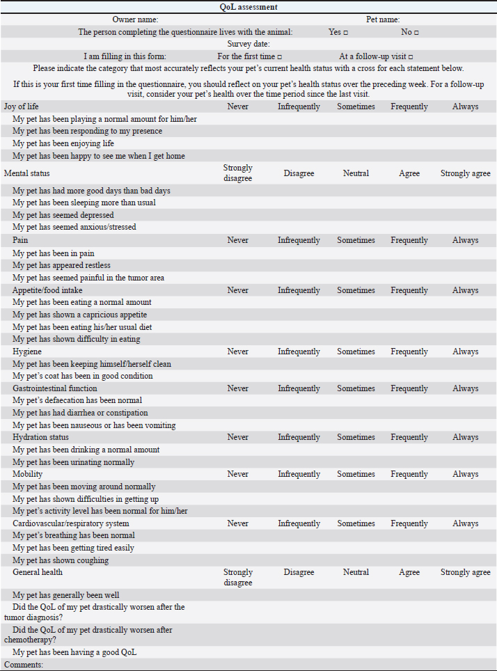 AbstractBackground: Quality of life (QoL) is an essential factor in therapeutic decision-making for human patients and is commonly used as an endpoint in clinical trials of cancer treatments. Aim: To compare owners’ perception of QoL in canine and feline patients affected by different tumor histotypes treated with single-agent or multidrug protocols. Methods: Owners were asked to assess the impact on QoL of their pets undergoing chemotherapy treatment by answering a questionnaire and assigning a score to different health-related parameters reported to affect QoL. Results: Questionnaires of 101 patients (85 dogs and 16 cats), collected at different time points, were analyzed. Fifty-seven patients were given single-agent chemotherapy (carboplatin, doxorubicin, lomustine, melphalan, mitoxantrone, vinblastine, and vinorelbine), whereas 44 were given multiple-agent treatment. When diverse factors including chemotherapy treatment type (single-agent vs. multidrug regimens) and the onset and kind of adverse effects were considered, no significant variations in owners’ perceptions of their pets’ QoL were discovered. Conclusion: Chemotherapy type (single-agent vs. multidrug protocol) and related adverse events are shown, which did not influence owners’ perception of their pet’s QoL. Future prospective studies should look into clinical characteristics that might affect QoL, such as the patient’s age, tumor stage, and protocol purpose (curative vs. palliative). Keywords: Canine, Chemotherapy, Feline, Quality of life, Tumor. IntroductionQuality of life (QoL) as a measurable parameter is a relatively recent concept, which has gained increasing importance in veterinary medicine over the last decade (Yeates and Main, 2009). There is no universally accepted definition of QoL, but it is generally considered a multidimensional concept that involves subjective evaluation of factors that contribute to the overall well-being (Osaba, 2011; Giuffrida and Kerrigan, 2014; Yousefi et al., 2016). One of the fundamental goals in managing cancer patients, especially in a palliative setting, is to maintain the best possible QoL, independently of the tumor type affecting the patients and despite any implemented treatment (Hamilton et al., 2012). As perceived by owners, poor QoL has been reported as a common reason for euthanasia (Edney, 1998), and therapeutic success is also defined based on owners’ perception of their pets’ QoL (Levine et al., 2008). In veterinary oncology, several studies have focused on the impact of a particular type of chemotherapy protocol on owners’ perception of their pets’ QoL. Bowles et al. (2010) showed that the majority of owners positively described the experience of their animals undergoing carboplatin-based chemotherapy. Two studies have so far evaluated owners’ perception of QoL in dogs and cats affected by lymphoma (LSA) and receiving multidrug protocols; in both cases, owners reported that the treatment did not negatively impact the QoL of their pet (Mellanby et al., 2003; Tzannes et al., 2008). When deciding on a course of antineoplastic treatment, most owners consider several factors, including prognosis, time commitment, costs, and potential occurrence of adverse events (AEs). When compared to single-agent protocols in human medicine, multidrug protocols may increase response rates and even prolong progression-free survival, despite being associated with an increased rate of treatment-associated AEs (Kumar and Chakraborty, 2016). However, two early studies showed that increased toxicity does not always negatively impact QoL (Funaioli et al., 2008; Huober and Thurlimann, 2009). In most cases, when exploring the impact of AEs on QoL in human medicine, not only gastrointestinal and hematological toxicity are evaluated, but also more specific chemotherapy-related AEs (such as hand–foot syndrome and peripheral neuropathy) and cosmetic side effects (such as alopecia), potentially affecting the patient’s perception of QoL (Funaioli et al., 2008). Single-agent protocols in veterinary medicine have historically and anecdotally been associated with fewer side effects than multidrug protocols, and thus may be offered by clinicians as a first-line treatment option in elderly patients or in cases where owners do not accept the risk of their pet experiencing severe AEs (Moore and Frimberger, 2018). In a previous study evaluating factors potentially influencing owners to treat their pet with chemotherapy, vomiting was considered an acceptable side effect, but inappetence, weight loss, and depression were deemed to be unacceptable (Williams et al., 2017). At present, no studies are assessing any differences in QoL, as perceived by pet owners, in dogs and cats receiving single-agent versus multidrug protocols, and there are no results to guide clinicians when discussing treatment options for pets with cancer. The authors’ primary goal was to assess owners’ perceptions of their pets’ QoL while they were receiving maximum tolerated dose (MTD) chemotherapy, either as a single agent or as part of a multidrug protocol; as a secondary goal, they wanted to identify clinical factors that could be linked to a perceived decrease in QoL. Materials and MethodsA modified, translated version of a previously published questionnaire (Lynch et al., 2010) (Table 1) was given to owners of dogs and cats with newly diagnosed different tumor types, receiving MTD chemotherapy as part of a single-agent or multidrug protocol. Questionnaires were collected from four different European institutions from 2018 until 2019. Owners were asked to fill the questionnaire at different time points during the chemotherapy course, specifically prior to treatment start, while receiving chemotherapy, and at the end of the protocol. All the drugs used were administered at their published MTD; single-agent chemotherapy was defined as a protocol including one cytotoxic drug, whereas multidrug protocols include