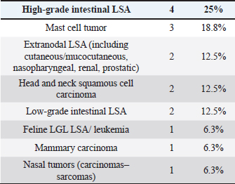 Cats were mostly domestic shorthair (n=14, 87.5%), followed by Ragdoll and Siamese (one each, 6.25%); median age was 12 years (range=6–15 years), eight cats were neutered females and eight neutered males. Tumor typesTwenty-seven tumor types were diagnosed (Tables 2 and 3). High-grade multicentric LSA was the most common in dogs (n=27, 31.8%), followed by cutaneous and subcutaneous MCT (n=16, 18.8%). Gastrointestinal LSA was the most common in cats (n=4, 25%), followed by cutaneous MCT (n=3, 18.7%). Chemotherapy protocolsWhen used as a single agent, chemotherapy included the following drugs: vinblastine (17), carboplatin (15), mitoxantrone (6), chlorambucil (5), lomustine (5), melphalan (5), vinorelbine (2), doxorubicin (1), and gemcitabine (1.) Multidrug protocols were as follows: CHOP (26), COP (7), LOPP (4), VAC (2), DMAC (1), COAP (1), carboplatin/doxorubicin (1), carboplatin/5-fluorouracil (1), and vinblastine/lomustine (1). Adverse eventsOf 101 patients, 51 (50.5%) did not show any AEs, while 50 animals (49.5%) showed at least one AEs. Twenty-three (39%) patients experienced gastrointestinal AEs (56% Grade 1, 39% Grade 2, and 5% Grade 4); 29 (49%) developed hematological toxicity, including 22 (76%) neutropenic events (41% Grade 1, 32% Grade 2, 18% Grade 3, and 9% Grade 4), 7 (24%) thrombocytopenic events (14% Grade 1, 44% Grade 2, 14% Grade 3, 14% Grade 4, and14% Grade 5); 2 dogs (3%) developed hepatotoxicity (Grade 2), 1 dog (2%) had cardiotoxicity (Grade 2), and 4 dogs (7%) developed lethargy (Grade 2). Table 3. Tumor types in cats.