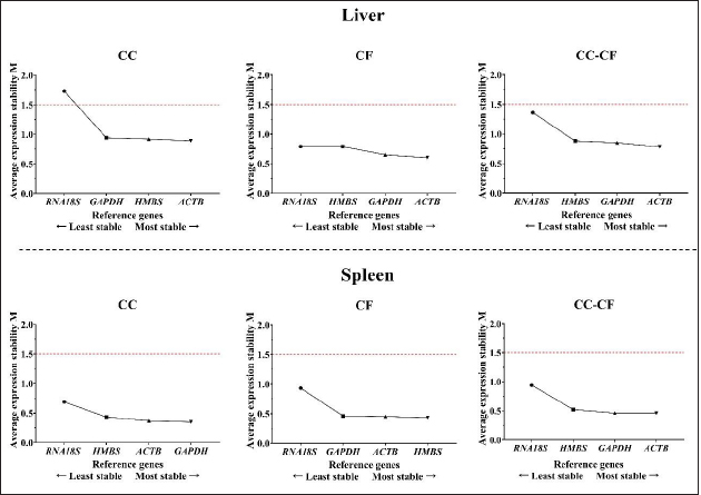 Fig. 3. M value of four candidate reference genes in liver and spleen tissues from laying hens housed in a cage and cage-free systems used the geNorm algorithm. CC: conventional cage; CF: cage-free; CC-CF: overall data. Table 2. Reference gene stability value ranked by geNorm and BestKeeper algorithm in liver and spleen of laying hens of the 80 weeks of production.