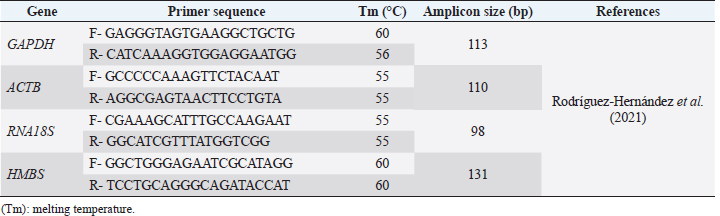 AbstractBackground: The liver and spleen play a pivotal role in metabolism and immune response. During stress, neuroendocrine response induces changes in gene expression, and its assessment demands the validation of the stability of the reference genes to perform relative gene expression experiments. Aim: The objective of this study was to determine the expression stability of four reference genes (GAPDH, ACTB, RNA18S, and HMBS) in the liver and spleen tissues from laying hens housed in a conventional cage (CC) and cage-free (CF) egg production systems. Methods: Liver and spleen from Hy-Line Brown hens housed in CC and CF egg production systems were used. mRNA transcript levels were determined by quantitative polymerase chain reaction (qPCR), and the gene expression stability was evaluated using geNorm, BestKeeper, and NormFinder algorithms. Results: The most stable gene from liver tissue was ACTB in CC, CF, and CC-CF groups (overall data). In the spleen, the most stable genes were GAPDH (CC), HMBS (CF), and ACTB (CC-CF). Conclusion: The ACTB gene was the most stable gene in the liver, and GAPDH and HMBS genes were stable in spleen tissues that could be used for the normalization in qPCR experiments performed in liver and spleen tissues of laying hens housed CC and CF production systems. Keywords: Laying hens, Liver, mRNA, Reference genes, Spleen. IntroductionChicken meat and eggs are the most consumed foods worldwide and continue to be a primary source of quality animal protein in developed and developing countries, contributing to global food security (Mench et al., 2011; Mottet and Tempio, 2017). Currently, the concern about animal welfare, particularly in food production animals, has been growing among consumers (Schuck-Paim et al., 2021). As a result, intensive commercial egg production systems are being evaluated, particularly in conventional cages (CCs), due to the restriction of moving and the inability to perform natural behaviors such as nesting, perching, and dust bathing, generating stress in birds (Løtvedt et al., 2017). Stress factors produce physiological behaviors and effective performance changes and affect gene transcription (Guo et al., 2020; Rostagno, 2020). In the stress responses, activation of the hypothalamic-pituitary-adrenal axis allows the release of glucocorticoids producing a physiologic response that affects the immune function and induces apoptosis of immature spleen and thymus cells, leading to the degeneration of primary lymphoid tissues, including the spleen, thymus, and bursa (Guo et al., 2020). The spleen is the largest immune organ of birds and is primarily responsible for regulating cellular and humoral immunity. However, the neuroendocrine response induced by stress alters the regulation of immune-related genes (El-Lethey et al., 2003; Zhang et al., 2018). Furthermore, in the case of the liver, multiple metabolic functions, including plasma protein synthesis, vitamin, glycogen storage, and fatty acid synthesis, have been reported in birds, which can be affected by glucocorticoids allowing the development of diseases in the long term (Hu et al., 2019). In studies of gene expression, variables such as cDNA concentration and differences in tissues and cells’ gene expression must be controlled (Vandesompele et al., 2002). Therefore, the relative gene expression method needs a reference gene as an internal control whose expression under experimental conditions is unaffected (Vandesompele et al., 2002). Therefore, validating the reference genes’ stability is necessary to consider them adequate for practical needs (Rocha-Martins et al., 2012). This study aimed to determine the expression stability of four reference genes (GAPDH, ACTB, RNA18S, and HMBS) in the liver and spleen tissues of laying hens housed in CC and CF egg production systems. Materials and MethodsStudy populationThe study was carried out using tissue samples from a previous project in the Laboratory of Immunology and Molecular Biology at the University of Tolima. Briefly, under commercial conditions, approximately 60,000 Hy-Line Brown pullets were placed in cages with a density of 16 pullets/cage (314.645 cm2/bird). Pullets were reared with the same sanitary conditions, management, and feed program until 15 weeks of age. Later, they were transferred into two different production systems, conventional cage (CC) and cage-free (CF), on the same farm, up to 82 weeks of age. A total of 45,000 hens were housed in CCs with 4 hens per cage (450 cm2/hen) and 15 replicates of 12 cages each (48 birds/replicate). For the CF system (deep litter), approximately 14,500 hens (1,111 cm2/bird) were distributed in 2 poultry houses, 15 rooms with 990 hens/room. Both systems offered water and the same diet, as well as health and nutritional management following company policies (Rodríguez-Hernández et al., 2021). Samples, RNA extraction, cDNA synthesis, and endpoint polymerase chain reaction (PCR)At 80 weeks of production, six hens (n=6) from CC and six hens (n=6) from CF were randomly selected, and 0.5 g of liver and spleen were extracted. Total RNA was extracted from tissue samples using an RNA-solv reagent kit (OMEGA, Norcross, GA) according to the manufacturer’s instructions. RNA concentration and quality were measured using the NanoDrop One (Thermo Scientific, Wilmington, DE), and cDNA was synthesized with GoScriptTM Reverse Transcription System kit (Promega, Madison, WI) following the manufacturer's instructions. Endpoint PCR and agarose gel electrophoresis of all genes were carried out to determine the cDNA quality and the amplicon size. The reaction had a total volume of 25 µl, composed of 14.8 µl of distilled-deionized water, 5 µl of 5× green GoTaq® Flexi Buffer (Promega, Madison, WI), 1 µl of dNTPs (1.5 mM) (Invitrogen, Carlsbad, CA), 1 µl of each primer (forward and reverse) (10 pmol/µl) (Table 1), 1 µl MgCl2 (25 mM), 0.125 µl of GoTaq® Flexi DNA polymerase (Promega, Madison, WI) 