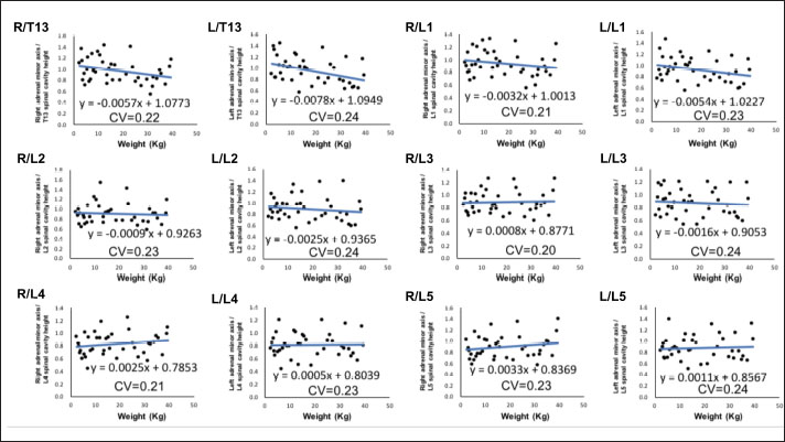 Fig. 2. Associations between adrenal minor axis/measurement site ratio and body weight. The bilateral adrenal minor axis/T13–L5 spinal cavity height ratio was calculated using data from randomly selected 40 dogs without adrenal disease. Scatterplots of weight vs. bilateral adrenal minor axis/T13 (right: R/T13, left: L/T13), /L1 (right: R/L1, left: L/L1), /L2 (right: R/L2, left: L/L2), /L3 (right: R/L3, left: L/L3), /L4 (right: R/L4, left: L/L4), and /L5 (right: R/L5, left: L/L5). Every black dot in the scatterplots indicates each case; the approximate straight line is indicated by a straight blue line, and the formula of each approximate straight line and the corresponding CV is shown below each straight line.