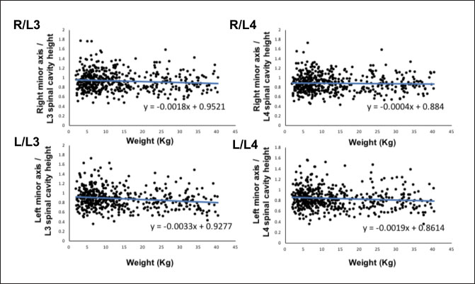 Fig. 4. Associations between the adrenal minor axis/L3 or L4 spinal cavity ratio and body weight. The associations were determined using the data from 474 dogs. Scatterplots of weight vs. right adrenal minor axis/L3 spinal cavity height (R/L3), right adrenal minor axis/L4 spinal cavity height (R/L4), left adrenal minor axis/L3 spinal cavity height (L/L3), and left adrenal minor axis/L4 spinal cavity height (L/L4). Each black dot in the scatterplots indicates each case; the approximate straight line is indicated by a straight blue line, and the formula of each approximate straight line is shown. DiscussionThe results of this study suggest that the adrenal minor axis/L4 spinal cavity ratio can be used as a novel index for measuring the size of the adrenal gland without dependence on body weight (right: 0.5–1.3, left: 0.5–1.4). The upper limits of the right and left normal adrenal minor axis/L4 spinal cavity ratios were 1.3 and 1.4, respectively. The minor axes of the left and right adrenal glands showed a moderate positive correlation with body weight (right: r =0.61, left: r=0.54). These results are similar to those of previous reports that used Ultrasound (Grooters et al., 1995, 1996; de Chalus et al., 2013; Soulsby et al., 2015). By contrast, compared with the strong positive correlation between the L4 spinal cavity height and body weight (r=0.82), the correlation between adrenal minor axis and body weight was not significant. It is thought that the spinal cavity is surrounded by bone and is unaffected by the surrounding soft tissue. A previous study has also reported that the size of the spinal cavity increases with increases in body weight (Hecht et al., 2014; Seo et al., 2014). These results suggest that the size and weight of the spinal cavity may be repatriated because the adrenal glands that show an adrenal minor axis/L4 spinal cavity ratio that exceeds the upper limit (right 1.3, left 1.4) are likely to be swollen. Adrenal size may be affected by various factors, among which body weight is relatively important (Grooters et al., 1995, 1996; Boozer et al., 2005; de Chalus et al., 2013; Soulsby et al., 2015). By dividing by the L4 spinal cavity height, which strongly correlates with body weight, the adrenal minor axis/L4 spinal cavity ratio had no correlation with body weight. Because adrenal size did not change even if the body weight increased, the adrenal gland/L4 spinal cavity ratio may be an independent index of body weight.
