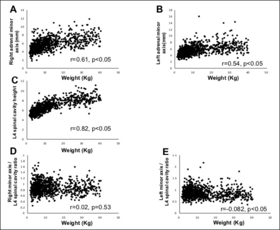 Fig. 5. Associations between adrenal minor axis, L4 spinal cavity height, adrenal minor axis/L4 spinal cavity ratio, and body weight. The associations were determined using the data from 939 dogs without adrenal disease. Scatterplots of body weight vs. left/right adrenal minor axis, L4 spinal cavity height, or left/right adrenal minor axis/L4 spinal cavity ratio. Each black dot in the scatterplots indicates each case; correlation coefficients (r values) and p values are shown. The right adrenal minor axis (A) and left adrenal minor axis (B) show a moderate positive correlation with body weight. The L4 spinal cavity height (C) shows a strong positive correlation with body weight. The right adrenal minor axis/L4 spinal cavity ratio (D) and left adrenal minor axis/L4 spinal cavity ratio (E) show no correlation with body weight. In humans, adrenal activation is induced in patients with multiple myeloma, chronic lymphocytic leukemia, lung cancer, and other malignancies (Jenkins et al., 1999). In dogs, adrenal swelling is induced by a malignant tumor and severe illness (Kaplan et al., 1995; Jenkins et al., 1999; Sacornrattana et al., 2013). This study excluded dogs with suspected adrenal disease but included those with various other diseases. Therefore, there is a possibility that adrenal activation and inactivation were affected by these diseases (Jenkins et al., 1999). This study is subject to further limitations. First, we acknowledge the possibility of a breed bias. There may be differences in the size and morphology of the adrenal gland and spinal cavity according to breed, and the extent of effect of this potential bias on the results of this study remains unclear. Second, the dogs included in this study, although without adrenal disease, were unhealthy; the effects of different drugs used for the management of diseases on adrenal size are unknown. Future studies must determine factors that may affect adrenal size and optimal standard values for the detection of adrenal incidental tumors. In conclusion, this study measured the left and right adrenal minor axes and L4 spinal cavity height in 979 dogs without adrenal disease and calculated the adrenal minor axis/L4 spinal cavity ratio, which showed a significant correlation with body weight. Adrenal size did not change even if the body weight increased (right: r=−0.082, p < 0.05; left: r=0.02, p=0.53). Our results indicate that the adrenal minor axis/L4 spinal cavity ratio can be used as an index of adrenal gland size that is unaffected by body weight. Patients showing an adrenal minor axis/L4 spinal cavity ratio that exceeds the upper limit (right 1.3, left 1.4) may have adrenal swelling. AcknowledgmentsThe authors thank Editage (www.editage.jp) for the English language editing of this manuscript. Conflict of interestThe authors declare that there is no conflict of interest. Authors’ contributionsConceptualization and writing the original draft: Ryutaro Yoshikawa, Fumitaka Yoshikawa, Sho Goto, Ryota Iwasaki, and Takashi Mori. Investigation: RyutaroYoshikawa and Fumitaka Yoshikawa. Data curation: Ryutaro Yoshikawa, Fumitaka Yoshikawa, Sho Goto, Ryota Iwasaki, and Takashi Mori. Statistical analysis: Ryutaro Yoshikawa and Fumitaka Yoshikawa. Writing review and editing: all authors. Supervision: Takashi Mori. ReferencesBaum, J.I., Boston, S.E. and Case, J.B. 2016. Prevalence of adrenal gland masses as incidental findings during abdominal computed tomography in dogs: 270 cases (2013-2014). J. Am. Vet. Med. Assoc. 249, 1165–1169. Bertolini, G., Furlanello, T., De Lorenzi, D. and Caldin, M. 2006. Computed tomographic quantification of canine adrenal gland volume and attenuation. Vet. Radiol. Ultrasound. 47, 444–448. Boozer, A.L., Behrend, E.N., Kemppainen, R.J., Whitley, E.M., Smith, A.N. and Busch, K.A. 2005. Pituitary-adrenal gland axis function in dogs with neoplasia. Vet. Comp. Oncol. 3, 194–202. Colliard, L., Ancel, J., Benet, J.J., Paragon, B.M. and Blanchard, G. 2006. Risk factors for obesity in dogs in France. J. Nutr. 136(7 Suppl.), 1951S–1954S. Courcier, E.A., Thomson, R.M., Mellor, D.J. and Yam, P.S. 2010. An epidemiological study of environmental factors associated with canine obesity. J. Small Anim. Pract. 51, 362–367. de Chalus, T., Combes, A., Bedu, A.S., Pey, P., Daminet, S., Duchateau, L. and Saunders, J.H. 2013. Ultrasonographic adrenal gland measurements in healthy Yorkshire terriers and labrador retrievers. Nat. Histol. Embryol. 42, 57–64. Evans, H.E. 2013. Miller’s anatomy of the dog, 4th ed. Saint Louis, MO: Saunders/Elsevier, pp: 418. Gregori, T., Mantis, P., Benigni, L., Priestnall, S.L. and Lamb, C.R. 2015. Comparison of computed tomographic and pathologic findings in 17 dogs with primary adrenal neoplasia. Vet. Radiol. Ultrasound. 56, 153–159. Grooters, A.M., Biller, D.S. and Merryman, J. 1995. Ultrasonographic parameters of normal canine adrenal glands: comparison to necropsy findings. Vet. Radiol. Ultrasound. 36, 126–130. Grooters, A.M., Biller, D.S., Theisen, S.K. and Miyabayashi, T. 1996. Ultrasonographic characteristics of the adrenal glands in dogs with pituitary-dependent hyperadrenocorticism: comparison with normal dogs. J. Vet. Intern. Med. 10, 110–115. Hecht, S., Huerta, M.M. and Reed, R.B. 2014. Magnetic resonance imaging (MRI) spinal cord and canal measurements in normal dogs. Anat. Histol. Embryol. 43, 36–41. Holmes, K.L., Morris, P.J., Abdulla, Z., Hackett, R. and Rawlings, J.M. 2007. Risk factors associated with excess body weight in dogs in the UK. J. Anim. Physiol. Anim. Nutr. 91, 166–167. Jenkins, P.J., Sohaib, S.A., Trainer, P.J., Lister, T.A., Besser, G.M. and Reznek, R. 1999. Adrenal enlargement and failure of suppression of circulating cortisol by dexamethasone in patients with malignancy. Br. J. Cancer. 80, 1815–1819. Kanda, Y. 2013. Investigation of the freely available easy-to-use software ‘EZR’ for medical statistics. Bone Marrow Transplant. 48, 452–458. Kapl