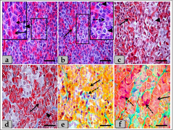 Fig. 2. Illustrative photomicrograph of the pd (a–c) Showing the basophils (dashed arrow), acidophils (arrow), and chromophobes (arrowhead). (d) showing the acidophils (arrow) and intercellular collagen fibers (arrowhead). (e) showing the acidophils or orangeophils; somatotrophs and mammotrophs (arrow), basophils; adrenocorticotrophs (dashed arrow). (f) showing the orangeophils; somatotrophs and mammotrophs (arrow), basophils; thyrotrophs (dashed arrow). Stain: (a,b) H&E, (c,d) Blue Masson’s trichrome, (e,f) Br-Ab- OFG. Scale bars: a–f=40 µm. Some of the glandular epithelial cells appeared, forming a well-defined follicle (Fig. 4a,b and d) whose lumina was filled with large globules and masses of colloidal materials forming colloid filled cyst which reacted positively with alcian blue stain (Fig. 4e and f). In addition, this follicle was observed lined with simple cuboidal epithelium with rounded, central nuclei or columnar epithelium to pseudostratified columnar type in some areas of the strands intermingled with numerous goblet-like cells filled with mucoid substances (Fig. 4b and d). Moreover, a fine reticular network was entwisted around the parenchymal epithelial cells, either arranged in clusters or follicles, and the blood capillaries (Fig. 4c). The pd margin facing pi was covered with simple cuboidal or columnar epithelium to pseudostratified stratified columnar type in some areas (Fig. 5a and b) with interposing goblet-like cells filled with mucoid substances that gave a strongly positive reaction with AB stain (Fig. 5c). The hypophyseal cleft was obvious between pd and pi (Fig. 5b and c), and in some sections, it was filled with amorphous or gelatinous colloid-like substances. Upper to the cone, the pi was a narrow region between the pd and pn, which surrounded the pn, excluding the hypophysis stalk. It was separated partially from the pd by the hypophyseal cleft but closely associated with the pn (Fig. 5a, b and d). The pi was observed housing fewer BVs than the highly vascular pd. It was well-developed in sheep, and with H&E stain, it was filled only with weakly basophilic large cuboidal or polygonal cells with round or oval nuclei. They were arranged in parallel rows, cords (Fig. 5d and e), or in follicles containing a colloid-like substance (colloid-filled cysts) that were frequently seen distributing throughout the pi (Fig. 5f). Furthermore, some follicles appeared to be filled with amorphous substances, while others had only a little, or devoid of any materials in some of the examined sections. Several colloid-filled cysts of variable size and shape were observed within the pi and lined with simple cuboidal to the pseudostratified columnar epithelium (Fig. 5f). With alcian blue and PAS stain; the colloid clarified strongly positive reaction with two stains. Meanwhile, with PFA–AB-PAS- Orange G, these cells stained brightly pink and called melanotropes (Inset box of Fig. 5e).
