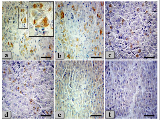 Fig. 8. A photomicrograph of the WC parenchyma, (a–d) showing positive immunohistochemical reactivity of individually distributed gonadotrophs against anti-FSH antibodies (a,b) and anti-LH antibodies (c,d). (e,f) showing the central part of the cone that was observed devoid of any positive immune reactions against anti-FSH and LH antibodies, respectively. Stain: (a,b,e) Immunohistochemical stain against anti-FSH antibody & (c,d,f) immunohistochemical stain against anti-LH antibody. Scale bars: a–f=40 µm. Acidophils were larger than the chromophobes; most were located in the central and lateral parts of pd. They were round or ovoid-shaped, sometimes triangles. Its cytoplasm was stained pink with H&E, but with special stains, the acidophils could differentiate into somatotrophic & LC, and dyed orange with orange G and so were described as orangeophils. However, lactotrophs were smaller and had fewer secretory granules than somatotrophs. These findings are very close and similar to the results described by Jafri (1979) in fish, who clarified that, and with Ye et al. (2018) in Bactrian camels (Camelus bactrianus) who claimed that somatotrophic cytoplasm could be stained orange with orange G and lactotrophic cytoplasm stained nacarat by azocarmine and orange G. BC were less numerous but larger than the acidophils. Their cytoplasm had small-sized and less numerous secretory granules located mainly at the marginal area of the cell cytoplasm. They stained light basophilic with H&E, but with special dyes, the basophil could be differentiated into three different types; corticotrophs, thyrotrophs, and gonadotrophs that stained magenta or purple by PAS. In addition, their cytoplasmic cells had small and less secretory granules located at the periphery of cells. Such diversity is very close to the finding reported by Ye et al. (2018) in Bactrian camels (Camelus bactrianus) and Phyllis Bowie et al. (1974) in rats, who clarified that the secretory granules of the ACTH cell are responsible for the positive PAS reaction. However, compared with another rat anterior pituitary cell types, the corticotroph is relatively poorly granulated, with those granules present being aligned near the plasmalemma. The pi was a narrow region between the pd and pn. It was separated partially from the pd by the hypophyseal cleft but closely associated with the pn. It was filled with weakly basophilic cuboidal or polygonal cells that were arranged in parallel rows or in follicles containing a colloid-like substance that was frequently seen throughout the pi. Furthermore, some follicles appeared to be filled with amorphous substances, while others had only a little or were devoid of any materials in some of the examined sections. These findings were very close and similar to the findings clarified by Perry et al. (1981) in adult sheep.