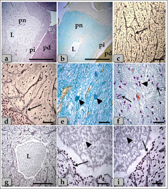 Fig. 9. A sagittal section of the sheep pituitary gland (a) showing the pd, pi, pn, and lumen of pn (L). (b) showing the water-drop shape of pn. (c) showing the unmyelinated nerve fibers oriented in many different directions in pn (arrow). (d) showing the highly branching terminal ends of the unmyelinated nerve fibers; palisode zone (arrow). (e) showing the dilated terminal ends of unmyelinated nerve fibers; herring bodies (arrowhead). (f) showing the PP (arrow) and FP (arrowhead). (g–i) Higher magnification of (a), (g) showing the large wide cavity filled with gelatinous material in the center of the pn (L). (h,i) showing ependymal-like cells lining the cavity of pn (arrow) and detached secretory products from the cavity lining cells filling the cavity. Stain: (a,g–i) Gomori’s reticulin, (b,e,f) PFA-AB-PAS-OG, (c,d) Bielschowsky technique. Scale bars: a,b=400 µm, g=300 & c–i=40 µm. The WC was reported for the first time by Wulzen (1914) in an ox pituitary gland, who observed a kind of cone that projected from the pi surrounded by hypophyseal cleft and appeared tongue-like. This structure was thereafter stated by Getty (1975). Moreover, Shirasawa et al. (1985), in goats, paid attention to the special topographical correlation of the cone with pd. The present investigation confirmed the presence of a cone-like structure of glandular cells of the pituitary gland of an adult male sheep protruding from the pi towards the lumen of the hypophyseal cleft in the neighborhood of the pd. This finding is similar to Sethi and Singh (2009) on buffalo and Shirasawa et al. (1985) on goats. It was elongated and observed free along the majority of its length. But, posteriorly, the WC was continuous with the posterior region of the pi without any line of demarcations. Moreover, this cone was covered externally with lining epithelium of simple cuboidal to stratified epithelium on the side of the hypophyseal cleft. These investigations coincided with Girod et al. (1982) on the bovine pituitary. In addition, Ganfini (1922) elucidated this cone in fetal ram sections and denominated it "lobule intermedia," which is different from pi, "epithelial cells that invade the entire intermediate lobule" and observed the presence of “clear and dark cells.” Furthermore, Lubberhuizen (1927, 1931) observed this structure in the ovine fetus with the term “eminentia cylindrical.” Moreover, It was described by Legait (1964) in adult sheep and also in the ovine fetus by Racadot (1949), who named it a “chromophilic cone.” Using H&E and specific stains, three different cell types forming the cone parenchyma were clarified; acidophils, chromophobes, and basophils. Acidophils were arranged in clusters at the central part of the cone in between them; unstainable cells and chromophobes were present. Furthermore, basophils were placed in a cluster in the anterior and posterior parts of the cone. However, sporadic or individual basophils were also recognized in between acidophils. This finding is similar to Shirasawa et al. (1985) in goats, who described, through acceptable structural characteristics and immunohistochemical appearances, that the cells forming the cephalic cone typically resembled those of the pd. Furthermore, he reported six types of cells of the cephalic cone-like pd; chromophobes, GH cells, prolactin cells, ACTH cells, TSH cells, and LH cells. He demonstrated that the ultrastructure of GH cells in the cone resembled the prolactin cells. The secretory granules of both types are spherical; the diameter of the former is about 340 nm, whereas that of the latter is about 440 nm. ACTH cells are polygonal-shaped with secretory granules, about 180 nm in diameter, scattered throughout the cytoplasm. TSH cells, spherical in shape, contain the smallest secretory granules with a diameter of about 150 nm. The highly electron-dense LH cells contain numerous secretory granules with a diameter of about 210 nm and irregular nuclei. And also, our findings are supported by Sethi and Singh (2009), who mentioned three types of cells were recognized in the parenchyma of WC of buffalo fetus, i.e., acidophils, basophils, and chromophobes. Moreover, he clarified that the acidophils were predominately located on the periphery. They were oval-shaped with eccentric rounded nuclei. Similarly, observations were recorded by Waage (1953) on sheep. The basophils were round cone-shaped with centrally placed nuclei and were distributed throughout the lobe. Singh and Dhingra (1979) in goat fetuses claimed that basophils were stained with PAS and aniline–blue stains but exhibited no affinity for aldehyde fuchsin and suggested their role in the production of gonadotrophins as an aid to the secretion of pd. Moreover, Girod et al. (1982) of the bovine pituitary described some cells in WC that reacted with anti-oPRL antibodies and were either isolated or clustered. Other cells reacted with anti-hGH, anti-bLH, anti-βoLH, or anti-βhTSH antibodies. Some cells reacted simultaneously with anti-βMSH, anti-1–24ACTH, anti-17–39ACTH, and anti-βLPH, indicating the presence of basophils in the cephalic cone. But, on the contrary, Getty (1975) elucidated that the cells in the cephalic cone were primarily acidophils, somatotrophs, and mammotrophs cells without mentioning the presence of basophils. pn was raised as a ventral outpouching of the brain floor and observed as a water-drop shape. It consisted mainly of unmyelinated nerve fibers, herring bodies, pituicytes, and blood capillaries. Such diversity is similar to the finding stated by Eurell and Frappier (2006), Junqueira et al. (2010), and described by Mahmood (2014) in rats and Ye et al. (2018) in Bactrian camels (Camelus bactrianus). Large wide spaces, cavities, or pn lumen filled with gelatinous material were seen within the center of pn. This material was reacted negatively with both PAS and Alcian blue and suggested to be CSF. It appeared as a secretory product that was secrete