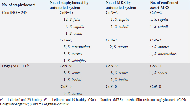 Staphylococcus species of veterinary relevance are difficult to identify and characterize due to the underdeveloped diagnostic protocols. The Phoenix automated system has been widely reported as an effective tool for the identifications and antimicrobial susceptibility of staphylococci; however, a few species are not distinguishable using this advanced system (Bannoehr et al., 2007). For instance, S. pseudintermedius is easily misdiagnosed with S. aureus, due to very close phenotypic characteristics requiring molecular methods for definite identification, such matrix assisted laser desorption ionization-time of flight mass spectrometry (MALDI-TOF MS) or PCR methods (Guardabassi et al., 2017). In the present study and due to limited available resources only the most significant genes associated with clinical complications were screened (i.e., mecA and pvl genes) and further molecular and epidemiological analysis are required. In conclusion, cats and dogs may harbor various staphylococci species and MRS strains of medical and public health concerns. The reported antimicrobial resistance among the CoNS warrants further attention and continuous monitoring by veterinarians and public health professionals. Preventative measures and antimicrobial stewardship are required to control and minimize the spread of MRS particularly in veterinary and animal medicine in Libya. Conflict of interestThe authors declare that there is no conflict of interest. Authors’ contributionMohamed O. Ahmed designed the study, analyzed data, and wrote the article. Hiam Elnageh and Murad Hiblu collected the samples and data, and performed most of laboratory protocols. Mohamed Abbassi and Yousef Abouzeed contributed to laboratory works and analysis of information. All authors approved the final manuscript. ReferencesAhmed, M.O. and Baptiste, K.E. 2018. Vancomycin-resistant enterococci: a review of antimicrobial resistance mechanisms and perspectives of human and animal health. Microb. Drug Resist. 24(5), 590–606. Ahmed, M.O., Baptiste, K.E., Daw, M.A., Elramalli, A.K., Abouzeed, Y.M. and Petersen, A. 2017. Spa typing and identification of pvl genes of meticillin-resistant Staphylococcus aureus isolated from a Libyan hospital in Tripoli. J. Glob. Antimicrob. Resist. 10, 179–181. Asante, J., Amoako, D.G., Abia, A., Somboro, A.M., Govinden, U., Bester, L.A. and Essack, S.Y. 2020. Review of clinically and pidemiologically relevant coagulase-negative staphylococci in Africa. Microb. Drug Resist. 26(8), 951–970. Bannoehr, J., Ben Zakour, N.L., Waller, A.S., Guardabassi, L., Thoday, K.L., van den Broek, A.H. and Fitzgerald, J.R. 2007. Population genetic structure of the Staphylococcus intermedius group: insights into agr diversification and the emergence of methicillin-resistant strains. J. Bacteriol. 189(23), 8685–8692. Cain, C.L. 2013. Antimicrobial resistance in staphylococci in small animals. Vet. Clin. North. Am. Small. Anim. Pract. 43(1), 19–40. Chah, K.F., Gómez-Sanz, E., Nwanta, J.A., Asadu, B., Agbo, I.C., Lozano, C., Zarazaga, M. and Torres, C. 2014. Methicillin-resistant coagulase-negative staphylococci from healthy dogs in Nsukka, Nigeria. Braz. J. Microbiol. 45(1), 215–220. Couto, I., Wu, S.W., Tomasz, A. and de Lencastre, H. 2003. Development of methicillin resistance in clinical isolates of Staphylococcus sciuri by transcriptional activation of the mecA homologue native to s. J. Bacteriol. 185(2), 645–653. Couto, N., Monchique, C., Belas, A., Marques, C., Gama, L.T. and Pomba, C. 2016. Trends and molecular mechanisms of antimicrobial resistance in clinical staphylococci isolated from companion animals over a 16 year period. J. Antimicrob. Chemother. 71(6), 1479–1487. Davis, J.A., Jackson, C.R., Fedorka-Cray, P.J., Barrett, J.B., Brousse, J.H., Gustafson, J. and Kucher, M. 2014. Carriage of methicillin-resistant staphylococci by healthy companion animals in the US. Lett. Appl. Microbiol. 59(1), 1–8. Drougka, E., Foka, A., Koutinas, C.K., Jelastopulu, E., Giormezis, N., Farmaki, O., Sarrou, S., Anastassiou, E.D., Petinaki, E. and Spiliopoulou, I. 2016. Interspecies spread of Staphylococcus aureus clones among companion animals and human close contacts in a veterinary teaching hospital. A cross-sectional study in Greece. Prev. Vet. Med. 126, 190–198. Frebourg, N.B., Lefebvre, S., Baert, S. and Lemeland, J.F. 2000. PCR-Based assay for discrimination between invasive and contaminating Staphylococcus epidermidis strains. J. Clin. Microbiol. 38(2), 877–880. Gandolfi-Decristophoris, P., Regula, G., Petrini, O., Zinsstag, J. and Schelling, E. 2013. Prevalence and risk factors for carriage of multi-drug resistant Staphylococci in healthy cats and dogs. J. Vet. Sci. 14(4), 449–456. Grice, E.A. and Segre, J. A. 2011. The skin microbiome. Nature reviews. Microbiol. 9(4), 244–253. Guardabassi, L., Damborg, P., Stamm, I., Kopp, P.A., Broens, E.M., Toutain, P.L. and ESCMID Study Group for Veterinary Microbiology. 2017. Diagnostic microbiology in veterinary dermatology: present and future. Vet. Dermatol. 28(1), 146–e30. Han, J.I., Yang, C.H. and Park, H.M. 2016. Prevalence and risk factors of Staphylococcus spp. carriage among dogs and their owners: a cross-sectional study. Vet. J. 212, 15–21. Harrison, E.M., Weinert, L.A., Holden, M.T., Welch, J.J., Wilson, K., Morgan, F.J., Harris, S.R., Loeffler, A., Boag, A.K., Peacock, S.J., Paterson, G.K., Waller, A.S., Parkhill, J. and Holmes, M.A. 2014. A shared population of epidemic methicillin-resistant Staphylococcus aureus 15 circulates in humans and companion animals. mBio. 5(3), e00985-13. Ibadin, E.E., Enabulele, I.O. and Muinah, F. 2017. Prevalence of mecA gene among staphylococci from clinical samples of a tertiary hospital in Benin City, Nigeria. Afr. Health Sci. 17(4), 1000–1010. Jarraud, S., Mougel, C., Thioulouse, J., Lina, G., Meugnier, H., Forey, F., Nesme, X., Etienne, J. and Vandenesch, F. 2002. Relationships between Staphylococcus aure