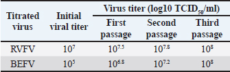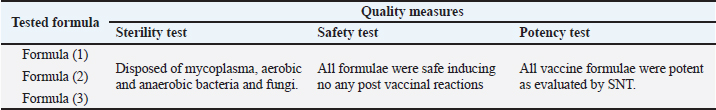 Proliferation and titration of BEF virus in tissue cultureThe virus (106.8 TCID50 / ml) was generated and proliferated in BHK cells for three consecutive times to rise the virus product till reached 108 TCID50 / ml. A notable CPE of BEF virus in BHK cells appeared as cell degeneration that end with the splitting of cells from the culture surface leaving hollow spaces. These stages of cellular changes take place within the initial 24 hours post infection and end usually within 72 hours post infection as shown in Figure 1c and Table 1. Determination of complete RVF virus inactivationInoculation of baby mice and in tissue culture with the inactivated RVF virus revealed its safety showing no mortalities or any abnormal signs of sickness in inoculated mice through 10 days post inoculation observation period and no CPE was observed in inoculated BHK cells, Quality control testing of the three prepared combines inactivated RVF and BEF vaccine formulae, revealed that all of them were free from foreign contaminants; safe in inoculated calves showing no any abnormal local or systemic clinical signs, and efficient inducing good levels of particular RVF and BEF antibodies in vaccinated calves as shown in Table 2. Monitoring of RVF neutralizing antibody levels in vaccinated calves using SNT showed that the peak NI was recorded on the second month (3.2) in Boostered calves in group-1 (vaccinated with formula-1) and on the third month in non-Boostered calves in the same group. Boostered calves in group-2 (vaccinated with formula-2) showed their peak of NI (3.6) on the third MPV while non-Boostered calves showed their peak NI (3.2) by the fourth MPV. The third calves ‘group had a peak of NI (3.88) in Boostered calves by the fourth (MPV) and 3.6 by the fifth MPV in non-Boostered calve while the non-vaccinated group showed non-protective. The recorded RVF neutralizing antibodies remained within the protective levels up to 9 and 10 MPV in Boostered calves in group-1 and other groups respectively as tabulated in Table 3. SNT achieved on serum samples gained from various vaccinated calves ‘groups showed that BEF neutralizing antibody levels in vaccinated calves showed that their peak of NI on the third MPV (2.5 and 1.7) in Boostered and non-Boostered calves respectively in group-1(vaccinated with formula-1). Boostered calves in group-2 (vaccinated with formula-2) showed their peak of NI (3.1) on the fourth MPV while non-Boostered calves showed their peak NI (2.5) by the fifth MPV. The third calves’ group had a peak of NI (3.1 and 2.6) in Boostered and non-Boostered calves respectively by the fifth MPV as shown in Table 4. Also, this table indicates that BEF neutralizing antibodies still remained within their protective levels up to the 9th and 10th MPV in Boostered calves in group-1 and other vaccinated groups respectively. Table 2. Quality control measures of Freeze-dried combined RVF and BEF vaccine.