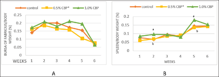 Fig. 3. Effect of adding clove buds powder to broiler feed in different levels on lymphoid organs weight in broiler chickens. (*): Clove Buds Powder. Different letters within a treatment indicate a significant difference between the means at the level of probability differences between the means at the level of probability (p < 0.05).