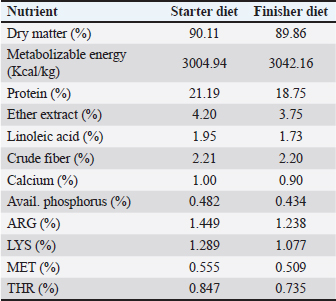 AbstractBackground: Phytogenic feed additives are products derived from plants used to improve the performance and health of animals. Nowadays, this type of phytogenic feed additive is widely used as an alternative to antibiotic growth promoters in poultry feed, and clove bud is one of the most effective medicinal herbs that has caught the attention of researchers. Aim: This experiment was conducted to evaluate the effects of adding clove bud powder to the broiler chicken’s feed on the hematological profile, biochemical parameters, lymphoid organs, and cell-mediated immunity. Method: A total of 360 unsexed chicks (Ross 308) were allotted to three groups. All chicks were raised under the same normal management conditions from 1 day to 6 weeks of age. The first group was fed a basal diet and the other two groups were assigned to add 0.5% and 1.0% of clove bud powder to the basal diet. The studied traits were total leukocyte counts (TLC), differential leukocyte counts (DLC), blood cholesterol level, blood liver enzymes [aspartate aminotransferase, alanine aminotransferase, and alkaline phosphatase (ALP) enzymes], the weight of lymphoid organs (bursa of Fabricius and spleen), and cell-mediated immunity. Results: Despite the significant and varied changes (p ≤ 0.05) that resulted from adding clove buds powder to the broiler feed in the second and third weeks, the results at the end of the experiment indicated that there was no negative effect of adding clove powder on the TLC and DLC, as well as the heterophils/lymphocytes ratio. In addition, feeding on a diet containing clove buds powder had no significant effect on the level of cholesterol and liver enzymes in the blood, except for (ALP), which showed a significant increase (p ≤ 0.01) in comparison to the control group. Moreover, the results showed in the second and fifth weeks a significant increase (p ≤ 0.05) in the relative weight of the spleen, but, in general, there were no significant effects at the end of the experiment on the relative weight of the lymphoid organs. Furthermore, the broiler chickens that consumed clove bud powder at a rate of 0.5% showed a highly significant (p ≤ 0.01) cellular immune response. Conclusion: This study concluded that the addition of clove bud powder had no negative effect on leukocyte counts or differentiated leukocyte counts. The addition also raised the spleen weight and improved the level of blood alkane phosphatase activity and cellular immune response in broiler chickens during the growth stages. Keywords: Broiler, Clove, Hematological profile, Biochemical parameters, Immunity. IntroductionAntibiotics have been used in animal production as non-nutritive additives because of their positive effect on nutritional efficiency and to control infectious diseases. The use of antibiotics in the poultry industry as growth promoters has been banned in many countries around the world due to increasing levels of microbial resistance to drugs (Castanon, 2007). Currently, research is directed toward natural and healthy alternatives to improve the productivity and health of poultry. Ever since the day medicinal plants are considered a natural and safe alternative to improve the performance and health of broilers (Amad et al., 2013), they have been attracting a great deal of research in the field of developing poultry feed. Cloves (Syzygium aromaticum) have several therapeutic properties and contain many biologically active compounds such as eugenol, eugenyl acetate, and beta-caryophyllene (Alma et al., 2007). The major component in clove is eugenol (Barceloux, 2008). Clove also contains hydrolyzable tannins (Dibazar et al., 2014), which have antimicrobial activity (Leite et al., 2007; Shrivastava et al., 2014), antiviral (Hussein et al., 2000), antifungal (Campaniello et al., 2010), anti-inflammatory, and antioxidant properties (Wati et al., 2015). Cloves have also been used as a natural growth enhancer (Sjafani et al., 2022), and this may be due to the significant improvement of the morphological condition of the intestine and increased intestinal absorption surface (Agostini et al., 2012; Othman et al., 2022). Also, dietary supplementation with clove stimulates the immune response (Gandomani et al., 2014). This experiment aimed to investigate the effect of adding different levels of clove bud powder to broiler chicken feed on the hematological profile, biochemical parameters, lymphoid organs, and cell-mediated immunity. Materials and MethodsThe experiment was conducted at the Poultry Research Station, Faculty of Agriculture, University of Tripoli, Libya. A total of 360 1-day-old- unsexed chicks (ROSS 308) were distributed to three treatment groups. Every group was replicated 6 times with 20 chicks/replicate, one chick was randomly taken from each replicate at the end of each week of the experiment to measure traits. The treatments included the control group that fed on the basal diet (Table 1) and the second group that fed on (the basal diet + 0.5% clove bud powder) and the third group that fed on (the basal diet + 1.0% clove bud powder). A starter feed was provided from 1 to 21 days and a finisher feed from 22 to 42 days of the experiment (Table 1), and water was available ad libitum. The chicks were raised under normal management conditions on floor pens with a wood-shaving floor (1.5 × 1.3 m), and the temperature was gradually decreased from 35°C to 21°C till the end of the experiment (42 days). All chicks were vaccinated according to the vaccination program implemented by National Center for Animal Health, Libya. Table 1. Nutrient content of basal diet over different periods of production.