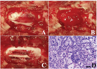 Fig. 2. Intraoperative findings of the case. (A) After durectomy, a dark reddish tumor tissue was identified. (B) After that, the tumor tissue bulged outward and seemed clearly demarcated from normal spinal cord. (C) Gross appearance of the surgical site after tumor removal using an ultrasonic surgical aspirator. (D) Histopathology of the biopsy specimen was consistent with nephroblastoma; HE stain, bar=50 µm. After treatment, the dog lived for approximately 10 years with mild proprioceptive deficits in the left hind limb. No tumor recurrence was observed on periodic follow-up magnetic resonance imaging (MRI) examinations carried out 10 and 21 months after surgery. Nine years after surgery, the dog returned to the hospital to evaluate the thoracolumbar spinal cord due to the gradual development of hindlimb weakness. Plain radiography of the thoracolumbar spine showed spondylosis deformans between T13–L1 and L2–3, with the former being consistent with the surgical site (Fig. 3A). MRI examination showed no recurrent tumor tissue in the thoracolumbar spinal cord; however, there was slight compression of the spinal cord from the ventral side at T13–L1 (Fig. 3B). This was thought to be due to the proliferation of bony tissues associated with intervertebral instability after laminectomy. The dog died 11 years after surgery for reasons unrelated to the tumor. According to the owner, the dog had vomiting of unknown cause for several months and died of aspiration pneumonia. No necropsy was performed. DiscussionRecovery of hindlimb paralysis after surgery for canine spinal nephroblastoma has been previously reported (Jeffery and Phillips, 1995; Macri et al., 1997; Brewer et al., 2011; Liebel et al., 2011; Tagawa et al., 2020). Liebel et al. (2011) noted that patients treated with surgery and/or radiation experienced longer survival than untreated ones. Although some unsuccessful surgical cases have been reported (Vaughan-Scott et al., 1999; Nakade et al., 2006), surgical treatment is generally effective. However, there are very few reports on the long-term survival of canine spinal nephroblastoma patients. Even in some reports describing long-term survivors, most of the follow-up periods were 2 years or less (Macri et al., 1997; Sale et al., 2004; Brewer et al., 2011; Liebel et al., 2011), although one case had survived for more than 3 years at the time of writing (Brewer et al., 2011). There are no detailed follow-up reports on survivors over 3 years. In our case, the spinal cord function of the dog recovered well after surgery, and the dog had lived for an additional 10 years, illustrating that long-term survival with sufficient neurologic function is possible after treatment, even in spinal nephroblastoma cases.