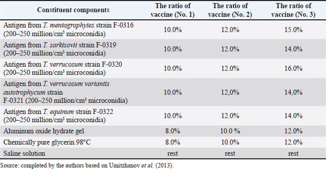 Table 3. Ratio of components of pentavalent inactivated vaccine against trichophytosis of farm animals.