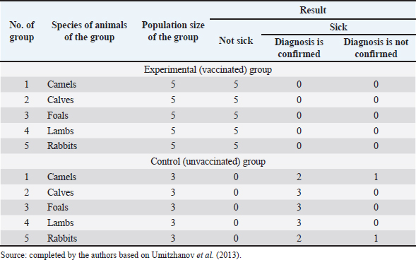 AbstractBackground: The annual increase in the number of camels entails a parallel increase in the incidence of trichophytosis, which poses a great threat to the health and life of both this species of animals and other organisms that contact and surround them. Aim: The aim of the study was to develop and establish the quality of vaccines inactivated by ultrasonic exposure for the prevention and treatment of trichophytosis in camels, and to compare them with chemically deactivated vaccines. Methods: The peculiarity of the technology of production of these vaccines was the use of an innovative method of inactivation of fungal strains by ultrasonic waves, which allowed to achieve high positive results in theory, and was subsequently confirmed in practice by immunizing sick and healthy animals. The first tests of the obtained vaccines were conducted in laboratory conditions on experimental rabbits. Results: The results of prophylactic and therapeutic vaccinations were one hundred percent positive, which made it possible to conduct further tests directly on camels of industrial farms, the expected result of which was also positively confirmed at the end of the research. Conclusion: As a result of this experiment, the effectiveness, stability, and safety of the manufactured vaccines were established, which made it possible to approve the regulatory and technical documentation and patent them as an innovative and effective development for the prevention and treatment of camel trichophytosis, which will reduce the growth of infection and further overcome the mass spread of the disease both among camels and among the surrounding organisms to which it is transmitted. Keywords: Monovaccine, Pentavalent vaccine, Trichophytosis, Trichophyton, Strain. IntroductionDermatomycoses is a group of diseases caused by pathogens—deuteromycetes (dermatophytes), which in turn are divided into three genera: Trichophyton—causing the disease known as trichomycosis (-phythia, -phytosis, ringworm); Microsporum—leading to microsporia (microsporosis) and Achorion—the clinical manifestation of which is favus (scabies). The most common cause of the lesion is Trichophyton. Among the different species, Trichophyton verrucosum and Trichophyton faviforme affect cattle and horses, whereas Trichophyton equinum and Trichophyton mentagrophytes (rarely) affect horses. On the other hand, carnivores (cats and dogs) and pigs are mostly affected by Trichophyton gypseum and T. mentagrophytes, while other species that are similar in morphology are detected much less frequently. However, the impact of the latter should not be underestimated, and it is important to pay attention to them, looking for methods of their suppression (Klymnyuk et al., 2004; Skibitskyi et al., 2012; Mohammadpour et al., 2020). According to the latest data, there are about 338,000 camels in the Republic of Kazakhstan, most of which are in Mangistau (41,500), Atyrau (17,300) and South Kazakhstan (16,900) regions. In addition to the number, there is also a great species diversity: compared to other countries of the world, where only two species of camels are common, in Kazakhstan there are about 32 existing hybrid species, which is due to two factors: firstly, the growing demand for camel milk, which is fermented to obtain the drink shubat and secondly, the fact that keeping camels in both large and small quantities is economically profitable for both small entrepreneurs and the country as a whole (Shoman, 2019). The complexity of the disease lies in the fact that the pathogen is easily transmitted by contact of a healthy animal with a sick one, and therefore the scale of spread is quite fast and large (Mel’nychuk and Hryshchenko, 2014; Yespembetov et al., 2019). There are two types of measures for combating camel trichophytosis: preventive measures and treatment measures. Preventive measures include sanitary and hygienic measures, climatic measures, and ecotrophological measures that ensure environmentally safe and rational nutrition. These measures are necessary because the causative agents of dermatomycoses are highly stable outside the body and can be transferred through various means, such as air, dust, water, household items, soil, and manure. However, these preventive measures do not guarantee full protection against infection with the pathogen. As a result, there is a threat of further spread of the disease, especially among young animals who are more sensitive to the disease and may experience a follicular or deep course of the disease (Gryshchenko and Lytvynenko, 2007; Vashchyk et al., 2020). In addition, preventive measures may not be effective during cold seasons when there is no solar radiation. The economic losses of the livestock sector due to this disease are also significant, not only in terms of animal mortality but also in terms of reduced growth, development, and productivity. On the other hand, treatment measures are needed to address the disease once it has occurred. Similarly, treatment, which is most often conducted by the use of antibiotics internally, does not always help in the treatment of pathogenic fungi with high contagiousness (Saiduldin, 2009; Levinson, 2014; Parker et al., 2021; Vakhidova, 2021; McVey et al., 2022). Although the issue of external treatment of trichophytosis in animals has been more or less solved by the use of ointments and solutions for the treatment of dermatomycotic skin lesions, as well as disinfectants to prevent the disease (Romich and Wagner, 2020; Mohamed et al., 2022). However, the annually increasing number of camels further complicates the situation and requires urgent attention and action, in the form of the creation and production of a safe and effective vaccine as the most effective way to combat trichophytosis, which is being worked on by scientists in Kazakhstan and other countries of the world, and which is also the purpose of this study. The aim of the study was to develop and establis
