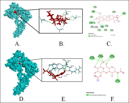Fig. 3. (A–C) The molecular interaction prediction between asiatic acid from CA and the IGF-1R compared to the IGF-1-insulin complex (D–F). Table 1. The binding interaction between asiatic acid and the IGF-1R.