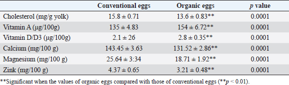 Table 3. Mean values of some nutrient contents levels in conventional (n=200) and organic (n=200) eggs.