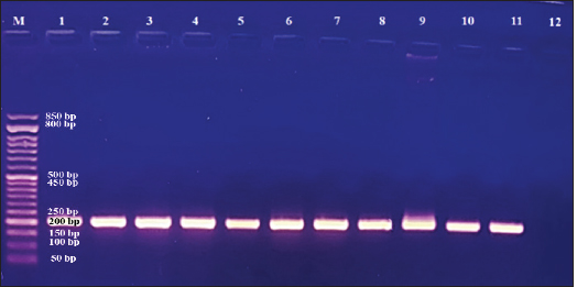 Fig. 1. Amplification of pld gene specific for C. pseudotuberculosis. Lane M: DNA marker, lanes 12: Negative control with water, Lane 1–11: amplified pld (203 bp) gene in isolated C. pseudotuberculosis. Table 1. The isolation rates of C. pseudotuberculosis from inspected slaughtered sheep and goats in abattoirs of Duhok Province, Iraq, based on PCR.