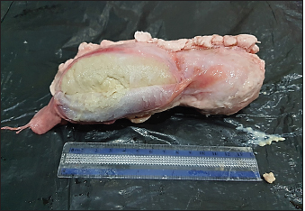 Fig. 2. CLA of mediastinal lymph nodes in infected sheep, size 15 cm. Regarding the geographic distribution of the isolates, the data revealed a relative genetic similarity (grouped under the same genotype or ERIC type), such as (strain No. 14, 13, 16, 15, 12, and 11) from Amedi, Bardarash, and Zakho, (strain No. 9, 8, 7, and 1) from Akre and Duhok, (strain No. 5 with 4) from Duhok. DiscussionThe current study employed molecular methods to estimate the prevalence rate of the disease among slaughtered sheep and goats, and it assessed how risk variables affected the disease’s prevalence. The data found that the rates of CLA in sheep and goats were 0.94% and 1.93%, respectively. These findings are in line with prevalence rates that were reported in slaughtered goats (1.1%) at the local slaughterhouses in Elazig Province, in the east of Turkey (Çetinkaya et al., 2002) and 2.4% in clinically examined goats in Rajasthan, India (Kumar et al., 2012) and in line with the prevalence rate (1.93%) in sheep slaughtered in Sumel district of Duhok Province, Iraq (Issa et al., 2021). Whereas, higher rates of CLA in sheep (26.3%) and goats (45.5%) were reported by Algammal (2016) in Menoufia Governorate, Egypt, and Rizk et al. (2019) who reported the prevalence rate of the disease (13%) in sheep and goat in Beni-Suef Governorate in Egypt. The lower prevalence rates of the infection observed in sheep and goats in the present study are probably due to better management practices and the climatic conditions of the region. The data also revealed that the prevalence of the diseases was significantly higher in goats than in sheep, which is in line with what was reported by Abebe and Sisay Tessema (2015). The higher rate in goats than in sheep is probably because of the variation in management systems and the environmental conditions where sheep and goats were raised. Goats are commonly raised in mountainous regions, whereas sheep are commonly found in plain areas; the mountainous areas of the study areas are colder; the ambient temperature, which may also be attributed to the disease’s endemic nature, significantly influences the survival of the causal agent in the contaminated environment (Augustine and Renshaw, 1986; Sá et al., 2018). Higher environmental temperatures may alter animal immunity and make animals more susceptible to infectious diseases (Al-Gaabary et al., 2009). In addition, goats may scrape their bodies against hard things often, which leads to a high incidence of superficial parotid, mandibular, cervical, and pre-femoral lymph node infections since they drain the shoulder area (Fikre and Abraha, 2014). Table 3. Texture of the affected lymphnodes with CLA in sheep and goats.