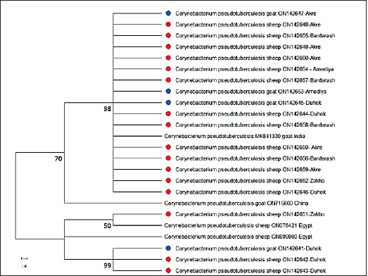 Fig. 3. Phylogenetic tree of C. pseudotuberculosis isolates based on partial sequences of 16S rRNA. The blue circles the goat’s strains and the red circles the sheep strains of this work. The numbers near the nodes indicate bootstrap values. In sheep, gross lesions of CLA were only observed in mediastinal lymph nodes. These findings agreed with those of other researchers who reported that the lungs and mediastinal lymph nodes were the two most often infected visceral organs by C. pseudotuberculosis (Oreiby, 2015; Ruiz et al., 2020). Whereas, in goats, CLA lesions were commonly observed in mediastinal- followed by, pre-femoral-, pre-scapular-, and submandibular lymph nodes. The higher rates of mediastinal lymph nodes are probably because of the age of the slaughtered animals; developing internal lesions of CLA increased with age (Oreiby, 2015). The high frequency of external lesions indicates a high risk of transmission that also supports our data of higher prevalence rates in goats than sheep in this study. The reason for increases in superficial lymph is not well understood, but they may be associated with the management system of the goats in mountainous areas, which increases skin abrasions that might facilitate the organism’s entry and could be common in the area. It has been reported that rupture of the granuloma increases the risk of contagion by eight times in those susceptible, since the released caseous content keeps the agent in the environment (Andrade et al., 2012). CLA lesions also revealed texture differences, including the presence of thick pus and distinct caseonecrotic dystrophic to calcified masses. The central zone of the lymph nodes differed as well; in sheep, the rates of lymph nodes with caseation was 50% (68/136) and onion-like appearance was 50% (68/136) which were almost twice that reported in goats with caseation (28.8%), and onion-like-appearance (20.3%). The variation in the rates between the sheep and goats is probably because of the location of the lesions, where caseation “onion ring” which is caused by a process of repetitive necrosis of the lesion capsule by the bacterial growth, followed by capsule reformation as a defense mechanism to limit the infection, is commonly found in mediastinal lymph nodes (Al-Gaabary et al., 2010; Ruiz et al., 2020). Factors linked with the occurrence of the disease in the investigated sheep and goats were considered and assessed. In terms of age, CLA was only found in both sheep and goats of older than 1 year. These findings are consistent with what has been published by Kaba et al. (2011) and Didkowska et al. (2020). The higher rates in older sheep and goats compared to younger animals are most likely owing to the older animals’ increased risk of bacterial infection, which increases CLA infection rates (Ali et al., 2016). Regarding the geographical distribution of the disease, variations were reported in the prevalence rates in sheep, the highest rate of the disease in sheep was reported in Sumel which is probably due to the intensive sheep farming system were practiced in the district. CLA has been observed to be more common in places where intensive husbandry is practiced (Abebe and Sisay Tessema, 2015). Whereas, in goats, the highest prevalence rate was reported in Amadi, and the lowest rate of CLA was reported in Akre. The higher rate in Amedi is probably because of the mountainous nature of the area and its climatic conditions compared to Akre and the other study locations.
