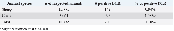 AbstractBackground: Caseous lymphadenitis (CLA) is a chronic suppurative bacterial infection caused by Corynebacterium pseudotuberculosis (C. pseudotuberculosis) affecting superficial and internal lymph nodes and internal organs of small ruminants. Aims: Through the use of molecular methods, this study aimed to estimate the prevalence of CLA and its contributing factors as well as the degree of genetic diversity and epidemiological relationships among C. pseudotuberculosis isolates from slaughtered sheep and goats in various districts of Duhok Province, Iraq. Methods: A total of 18,836 carcasses (15,775 sheep and 3,061 goats) were inspected by veterinarians at slaughterhouses [Duhok-Sumel (2,453 sheep + 627 goats), Zakho (6,000 sheep), Bardarash (1,117 sheep + 379 goats), Amedi (413 sheep + 178 goats) and Akre (5,792 sheep + 1,877 goats)] in Duhok Province for detection the prevalence rate of CLA using molecular techniques. Results: The prevalence of the disease was 0.94% and 1.93% in sheep and goats, respectively. Sheep in Duhok-Sumel and goats in Amedi were at a higher risk of infection than the animals in another location, with a prevalence rate of 4.31% and 6.18%, respectively. Sheep and goats of older age were more susceptible. Females were more susceptible than males in all districts except Duhok-Sumel where the reverse was true. ERIC-PCR analysis grouped the bacterial isolates into 11 different genotypes. The maximum likelihood phylogenetic tree of partial sequences of the 16S rRNA gene sequences of C. pseudotuberculosis revealed no divergent sequences discovered in this study. Conclusion: A strict control program needs to be applied to reduce the entrance of pathogen from neighboring countries. Keywords: Corynebacterium pseudotuberculosis, Sheep and goats, ERIC-PCR, Duhok, Iraq. IntroductionCaseous lymphadenitis (CLA) is a chronic debilitating bacterial infection caused by Corynebacterium pseudotuberculosis manifests as abscesses in internal organs, particularly the lung, as well as lymph nodes throughout the body (Algammal, 2016; Yitagesu et al., 2020). CLA in sheep and goats is a cosmopolitan bacterial infection that lacks effective control measures and has a poor response to treatment. It can persist in the environment, and it is difficult to detect subclinically infected animals (Abebe and Sisay Tessema, 2015). Once the disease is introduced into a flock of sheep or goats, there are no effective control measures in place (Abebe and Sisay Tessema, 2015; Karthik and Prabhu, 2021). The infection results in significant financial losses for sheep and goats industries through reducing milk production, reproductive problems for the affected animals, decreasing wool and meat production, condemnation of portions to the whole carcasses of the affected animals at abattoirs (Ruiz et al ., 2020; Bettini et al., 2022). Because of the lack of a reportable condition, the owners’ ignorance of the disease’s economic significance, and the fact that they seldom seek veterinary care for the disease’s superficial form and abscess development, it is unknown in many countries how common CLA is in sheep and goats (Costa et al., 2020). CLA in small ruminants is diagnosed using a variety of techniques and methods, including clinical signs and characteristics of the lesions, isolation, and identification of the causative agent from pus discharge (Nassar et al., 2016), serological methods (Yitagesu et al., 2020), and PCR (Issa et al., 2021; Terab et al., 2021) which is the most reliable, accurate, and rapid method, and it shows high resolution and repeatability in the genetic discrimination of bacterial strains (Taha, 2022). Accordingly, this study aimed to estimate the prevalence rate of CLA among slaughtered sheep and goats and to determine the role of different associated risk factors such as the animals’ species, age, and sex, as well as the geographical distribution of the disease in different locations in Duhok Province, Iraq. In the context of CLA, nothing, as yet, has been reported in Duhok Province on the prevalence rate of the disease among slaughtered sheep and goats using molecular techniques. In addition, it was unclear what risk factors were linked to the disease’s prevalence and to what extent they may contribute to the disease’s transmission in sheep and goats. Materials and MethodsStudy areasThe research was carried out from June 2021 to October 2022 to estimate the prevalence rate of CLA through bacteriological and molecular techniques in sheep and goats slaughtered at different abattoirs in five districts (Zakho, Duhok-Sumel, Bardarash, Amadi, and Akre) of Duhok Province of Iraq. Duhok is a governorate that lies in the northwest of Iraq and Western part of Kurdistan Region about 470 km north of Baghdad. Duhok has a strategic location since it is considered being a point of joint among three countries (Syria- Turkey- Iraq). Sampling and samples collectionDuring the study period, a total of 18,836 carcasses (15,775 sheep and 3,061 goats) were inspected by veterinarians at slaughterhouses in the study area for detection of CLA with strict adherence to the standard necropsy procedure applied at the local abattoirs. In the inspected animals, mediastinal-, pre-scapular, pre-femoral-, and submandibular lymph nodes were carefully screened for grossly visible abnormalities and texture. In total, 560 samples (enlarged lymph nodes) from sheep (n=399) and goats (n=161) were aseptically removed, collected, and delivered in clean, sterile specimen containers kept in a cool box to the Duhok Research Center at the College of Veterinary Medicine, University of Duhok, Iraq, for gross examination and laboratory investigation. During sample collection, the age and sex of slaughtered animals were recorded by using a preformed questionnaire. Besides, the location and size of lymph nodes were also considered. Isolation and molecular identification of C. pseudotuberculosisTo isolate the bacteria, 