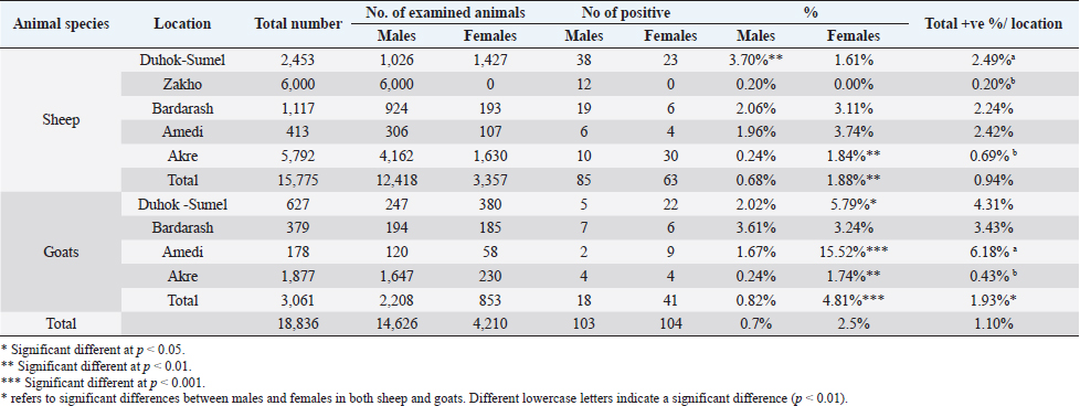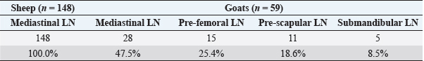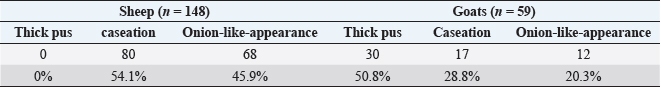 Table 2. Rates of gross lesions of CLA in collected lymph nodes of affected sheep and goats slaughtered at different abattoirs in Duhok Province, Iraq.