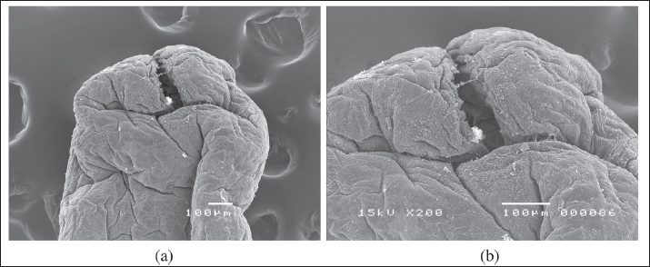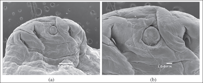 Fig. 5. SEM of the posterior end of a female L. serrata specimen showing a terminal cleft posteriorly (A, B: scale bar 100 μ).