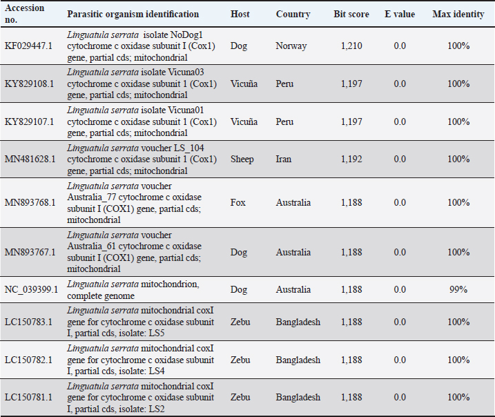 AbstractBackground: Linguatula serrata is a pentastomid zoonotic parasite with worldwide distribution. Although some cases of L. serrata infection have been reported in dogs, the epidemiology of this parasite remains largely unknown in developed countries. In recent years, canine linguatulosis has been repeatedly linked to cases of imported infections. This study aims to focus attention on this uncommon parasite through the presentation of a case report and an overview of the literature. Case Description: A 1-year-old intact female Borzoi imported from Romania to Italy sneezed spontaneously a worm-like parasite specimen. Morphological and molecular diagnosis identified the parasite as a female of the zoonotic pentastomid L. serrata (so-called European tongue worm) that lives in the nasopharyngeal tract of canids. Eggs of Linguatula were detected in the feces. Molecular identification (99%–100% homology) was based on DNA extraction, polymerase chain reaction of a 700-bp fragment of the mitochondrial cytochrome c oxidase subunit I gene, and alignment with BLAST analysis. Due to the possibility of other adult or juvenile specimens of the parasite still occurring in the dog, a treatment attempt with a combination of febantel/pyrantel/praziquantel was made. No parasite eggs were detected in fecal samples after the drug was administered. Endoscopy confirmed the absence of adult parasites and slight pathological changes. A follow-up examination conducted 3 months after the treatment did not reveal any clinical and laboratory abnormalities. Conclusion: Linguatula serrata appears to be currently prevalent in some European countries, but there are no recent extensive studies on the prevalence of canine linguatulosis, so the parasite frequently remains undetected and unreported in dogs as the diagnosis is often overlooked. Parasites not commonly found such as L. serrata can become increasingly prevalent and may be detected in imported dogs. Therefore, veterinarians must be aware of the possible presence of uncommon and exotic pathogens in these dogs, be able to recognize the relevant clinical signs, and diagnose the infection quickly. This will improve the prognosis in individual dogs, reduces the risk of possible public health implications, and reduces the risk of uncommon and exotic pathogens establishing new endemic foci. Keywords: Linguatula serrata, Linguatulosis, Imported dogs, Romania, Italy. IntroductionLinguatula serrata Frölich, 1789 is a cosmopolitan, zoonotic, and food-borne obligate parasite belonging to the subclass of Pentastomida within the phylum Arthropoda. Despite this, it is commonly called “tongue worm” because of the dorsoventrally flattened shape (Berberich et al., 2022). This parasite has an indirect life cycle. Dogs, wild canids (foxes, wolves, golden jackals, dingoes), cats, and many other carnivorous mammals can be definitive hosts while a wide range of ruminants (cattle, sheep, goats, buffaloes, camelids), rabbits (Barton et al., 2020), hares (Diakou et al., 2014), rats (Tavassoli et al., 2018), red-necked wallabies (Barton et al., 2019), and steppe field mice (Mohtasebi et al., 2021) are known intermediate hosts. Linguatula serrata is a zoonotic parasite. Humans can act as accidental intermediate hosts when they ingest water or vegetables contaminated by embryonated eggs of the parasite (Hajipour and Tavassoli, 2019), or as definitive hosts when they feed on raw or undercooked viscera containing infectious nymphs from a parasitized intermediate host, commonly sheep and goats (Hajipour and Tavassoli, 2019). Commonly, females measure up to 13 cm in length and males are up to 2 cm long (Melhorn, 2008). However, some Australian female specimens showed great morphological variation in total body length and were up to 15 cm long (Shamsi et al., 2020). The adult parasites live attaching to the mucous membranes of the nasal cavity, turbinates, and frontal sinuses of the definitive hosts, primarily dogs, by using their hooks. After mating, females lay up to 5,000,000 embryonated eggs per day (Melhorn, 2008). Eggs are passed into the environment via the nasal mucus (by coughing and sneezing) or are swallowed and then expulsed by the fecal route. The intermediate hosts become infested when they accidentally ingest larvated eggs from contaminated environments. After ingestion, the first instar larva hatches in the intestinal tract and migrates to mesenteric lymph nodes, liver, lungs, spleen, rarely eyes, and other tissues where it encysts as infective nymphal stage (so-called “C-shaped”) (Sievänen et al., 2021; Berberich et al., 2022). When ingested by a definitive host, nymphs migrate to the nasal cavity and frontal sinus where they develop into adult parasites within 6–7 months and can survive for up to 15 months (Melhorn, 2008). Humans can be aberrant final hosts after ingesting raw or poorly cooked viscera (Hajipour and Tavassoli, 2019). Reported prevalence values in dogs range from 37.45% in owned dogs in Nigeria (Oluwasina et al., 2014) to 76.5% in stray dogs in Iran (Oryan et al., 2008) and in wild canids range from 1.3% in foxes (Hodžić et al., 2016) to 67.6% in dingos (Shamsi et al., 2017). Moreover, some cases of occasional infections have been reported, sometimes as autochthonous cases (Principato et al., 1994; Paoletti et al., 2003; Bordicchia et al., 2014; Ioniță and Mitrea, 2016; Campbel and Jones, 2023) but more commonly as cases detected in dogs moved from a country to another country (Globokar Vrhovec et al., 2005; Mitchell et al., 2016; Villedieu et al., 2017; Springer et al., 2018; Thomas, 2018; Nagamori et al., 2019; Sievänen et al., 2021; Berberich et al., 2022; Macrelli and Mackintosh, 2022). This has led some authors to hypothesize that L. serrata infection might be considered an emerging parasitosis (Berberich et al., 2022). In Italy, little is known about the epidemiology of L. serrata. Data available in the literature are sporadic and li