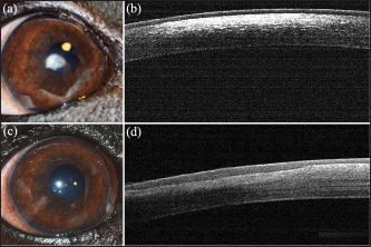 Fig. 4. Representative digital photographs and SD-OCT of a Cavalier King Charles Spaniel dog from group G2. (a) Before treatment, a digital photograph of the right eye showed a white and oval refracting opacity in the paracentral cornea and (b) an SD-OCT of the same eye revealed a hyperreflective area located in the anterior part of the axial stroma. (c) After 9 months of treatment with 1% CsA twice daily, no deposits were detected and (d) focal thickening of the epithelium was evident in the region where deposits were previously located. SD-OCT: Spectral Domain-Optical Coherence Tomography. Topical CsA has been shown to have a stimulatory effect on both the number of conjunctival goblet cells and the amount of mucin production (Phillips et al., 2000; Moore et al., 2001). Increasing mucin production would likely increase the time of permanence of the lacrimal film, improving the tear film stability and thus protecting the central part of the cornea. Although the present study shows that the use of topical 1%CsA eyedrops decreases the deposition of lipids in the central cornea, the mechanism of action is not fully understood. Increasing mucin production may extend the durability of the lacrimal tear film and, hence, avoid the deposition of lipids in the central cornea. Unfortunately, break-up times were not evaluated in this study, thus, this theory could not be demonstrated yet; however, we are currently investigating the possible correlation between CCD and the qualitative alteration of the precorneal tear film interferometry. In CCD, crystal deposits tend to be distributed in the central and coolest part of the cornea, and a temperature-dependent enzyme defect has been hypothesized to be the cause (Fielder et al., 1981). It has been demonstrated that local temperature changes can affect the melting point and thermal transition phases of lipids (Crispin, 2002; Tkáčová et al., 2011). Previous studies have evaluated the temperature of the cornea in patients with DES and have revealed that the temperature of the central cornea was significantly lower (Mori et al., 1997; Craig et al., 2000; Kamao et al., 2011; Versura et al., 2015). However, except for those kept in warmed conditions, all types of tear substitutes decrease the corneal temperature right after their application, but the temperature will increase with eyelid closure during normal blinking (Fujishima et al., 1996; Fujishima et al., 1997). Further investigation is required to assess whether topical CsA use modifies corneal temperature in dogs with CCD and its association with lipid deposition. In the present study, COD reduction seems to be faster and more marked with two daily medications than with one, indicating a frequency-dependent response to topical 1%CsA. If CsA is used for this purpose, monitoring STT values is strongly recommended, as overproduction of tears could be seen. Topical CsA has been used in human ophthalmology for more than 40 years and evidence supports its safety and efficacy in treating various ocular surface disorders (McCarthy et al., 1992; Reinhard and Sundmache, 1999; Sundmacher et al., 2001; Bonfioli et al., 2005; Spadavecchia et al., 2006; Duszak 2007). Ophthalmic emulsions of CsA are prepared in several different oil-based vehicles with concentrations ranging from 0.05% to 2% (Acheampong et al., 1998). In previous studies, our research group has shown that a combination of CsA and vitamin E was a safe and effective treatment for keratoconjunctivitis sicca and chronic superficial keratitis in dogs (Arteaga et al., 2021). Ophthalmic α-tocopherol (TOC) is the most effective antioxidant of the vitamin E family and is receiving special attention to prevent and treat retinopathies, cataracts, and DES, among other ocular pathologies (Xin et al., 2016). In our study, 100% TOC was used as a new solvent of CsA. TOC has been reported to substantially reduce the concentration of free radicals in the tear film and to improve the protection of corneal and conjunctival cells, thus, reducing the risk of inflammation and restoring the ocular surface from damage exposure (Aydemir et al., 2004; Zapata et al., 2008; Ribeiro et al., 2013; Olchawa et al., 2015; Tredici et al., 2020). Furthermore, TOC decreases the rate of corneal autolysis and keratocyte apoptosis (Bilgihan et al., 2001). Therefore, as the stromal cell cycle is reduced, there is less deposition of material rich in cholesterol and phospholipids. Even if the use of topical CsA has been associated with some adverse effects in dogs, in our study, only two dogs showed excessive tear production that was reversed after reducing the treatment frequency from twice to once daily (Gregory et al., 1989; Kaswan et al., 1989; Radziejewski and Balicki, 2016). The limitations of this study are mostly due to its design. Dogs and treatment were not randomized and the ophthalmologist performing the examination and follow-up evaluation was not masked. Another group only treated with ophthalmic TOC could have increased the power of the study. In the author’s experience, most patients with CCD also have a lipid tear film deficiency when evaluated by ocular surface interferometry (unpublished results), therefore, only TOC is unlikely to reduce CCD. Cristal corneal deposits were not classified by size thus, we could not objectively evaluate whether the dimension of the deposit could affect its dissolution. Our clinical observation indicated that smaller deposits were more likely to disappear than larger ones. In addition, the age of the participants was not evenly distributed among groups, and this could have added some bias since the temperature of the central cornea has been shown to decrease, while corneal opacities increase with age (Versura et al., 2015; Evans et al., 2018). Since the exact mechanism of action behind our findings remains unknown, more extensive research on the subject is needed that could use the present study as a guide in designing and implementin